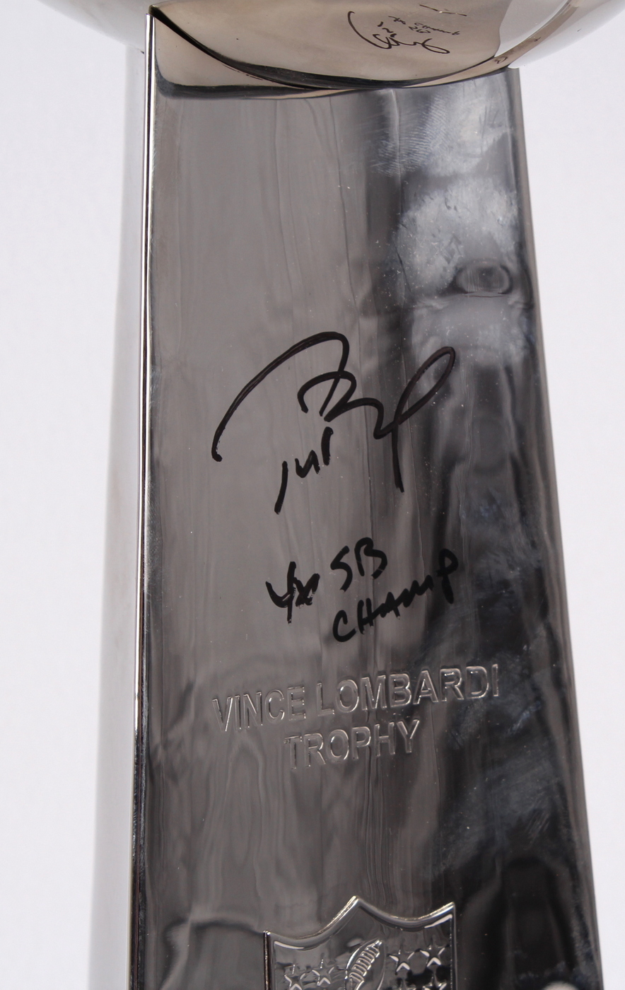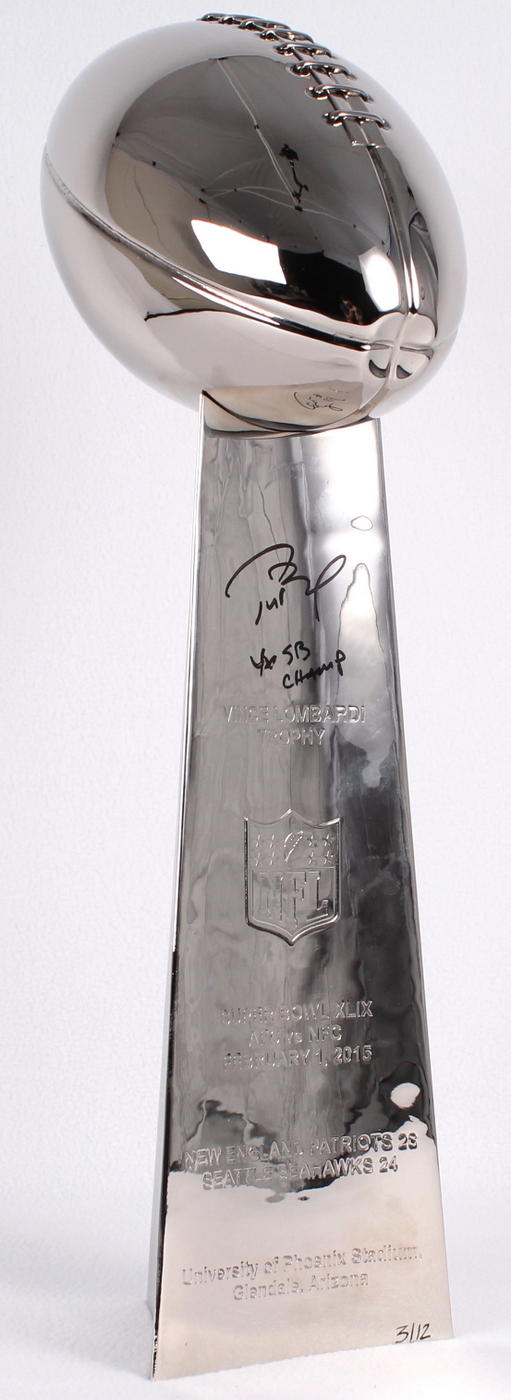 Full size replica Super Bowl XLIX Lombardi trophy measures 22" in height and is hand signed and inscribed in black felt-tip pen by Tom Brady (Patriots). Limited edition hand-numbered 3/12.