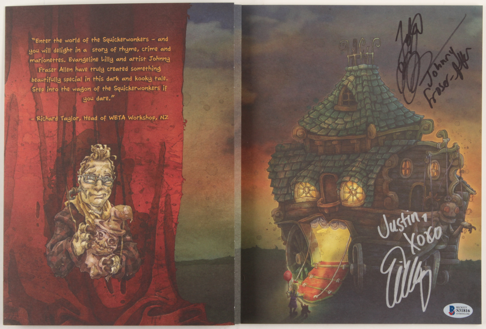 "The Squickerwonkers" softcover book inside page has been hand-signed in silver paint pen and black felt-tip pen by Evangeline Lilly and Johnny Foster-Allen. Please note, autograph has been personalized to "Justin." See images for details regarding the condition of the book.