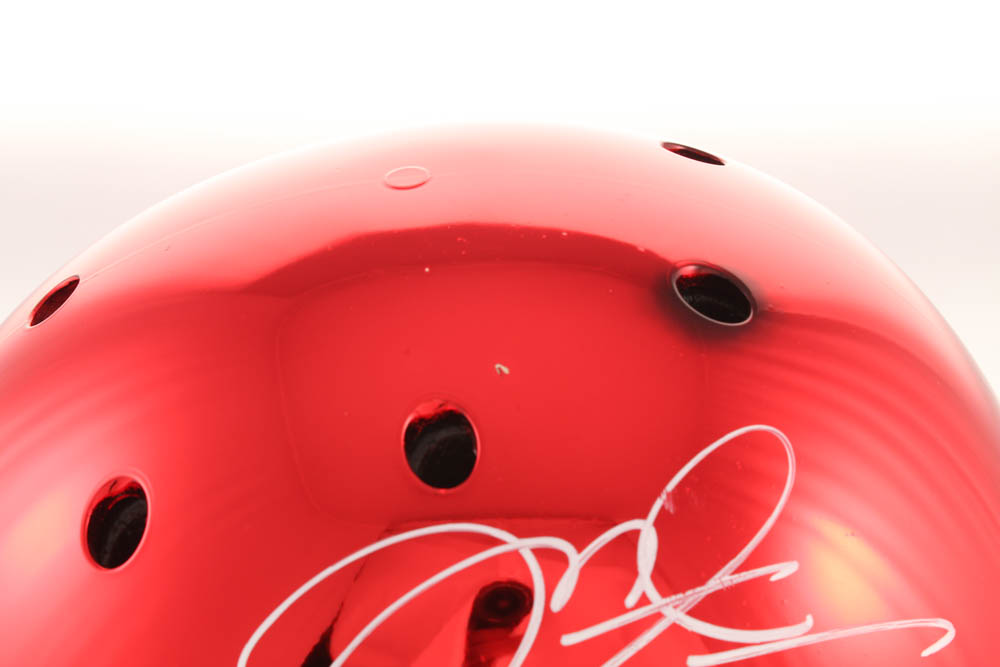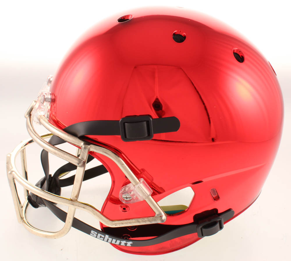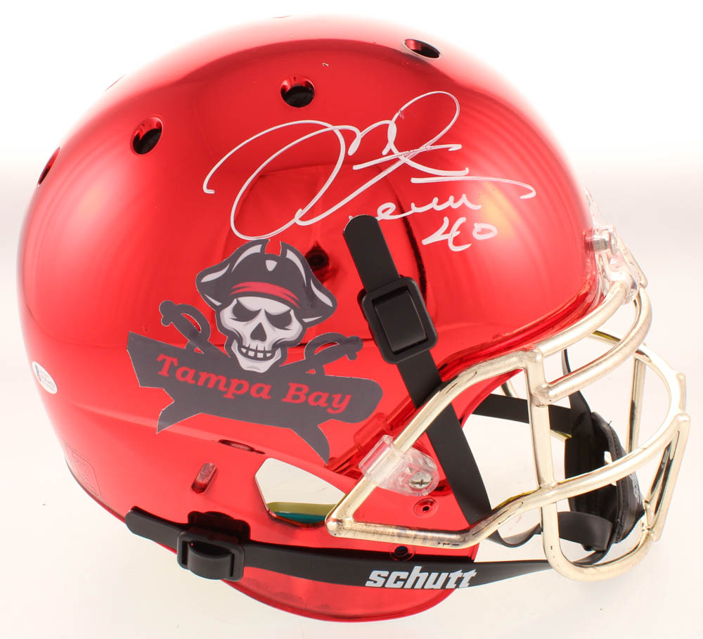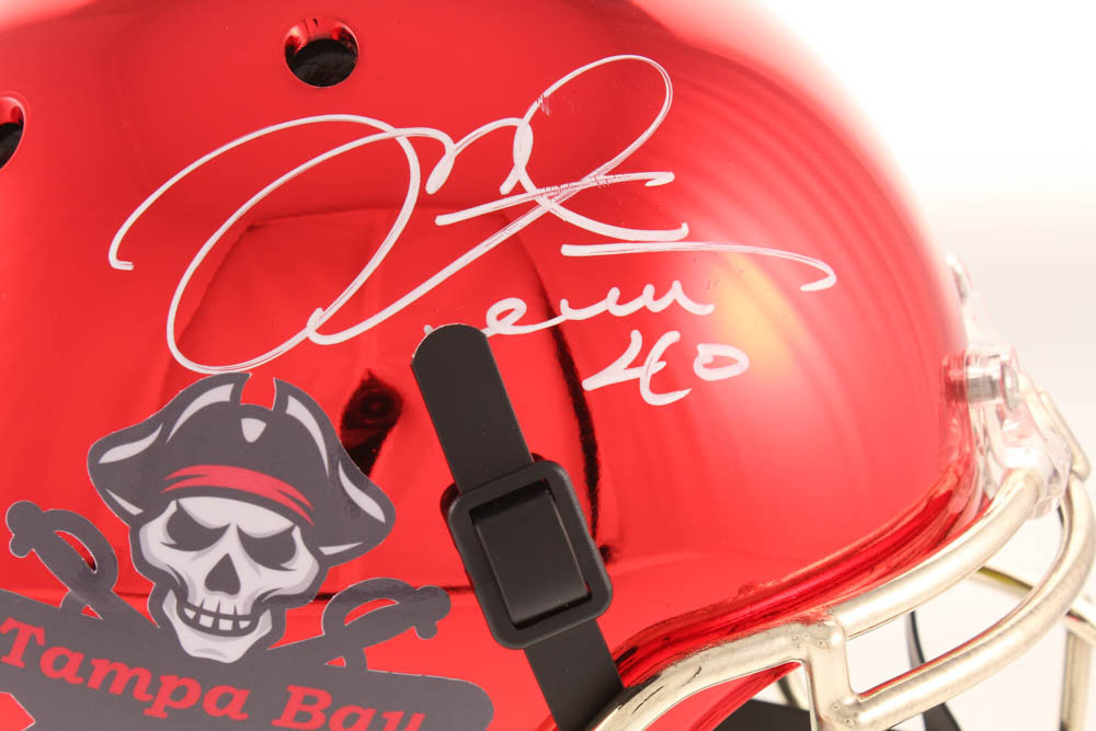 Schutt Tampa Bay Buccaneers full-size authentic on-field chrome helmet. Hand-signed in white paint pen by Mike Alstott.