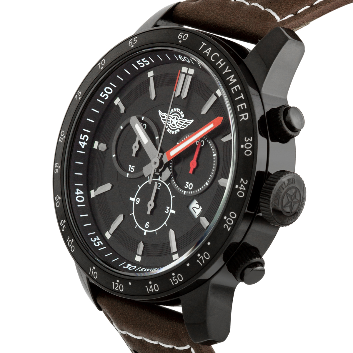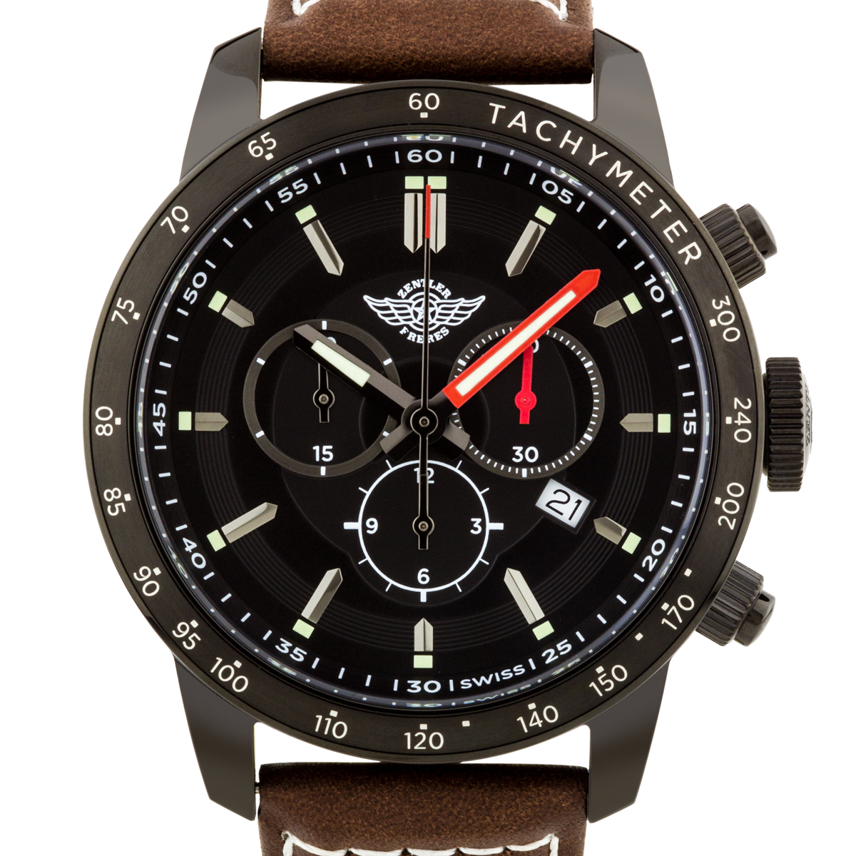 The Zentler Freres Oracle Men's Swiss Chronograph Watch features a brown genuine leather strap, black case, black bezel, black dial, and gunmetal indexes with C3 Superluminova. Please see photos for details.