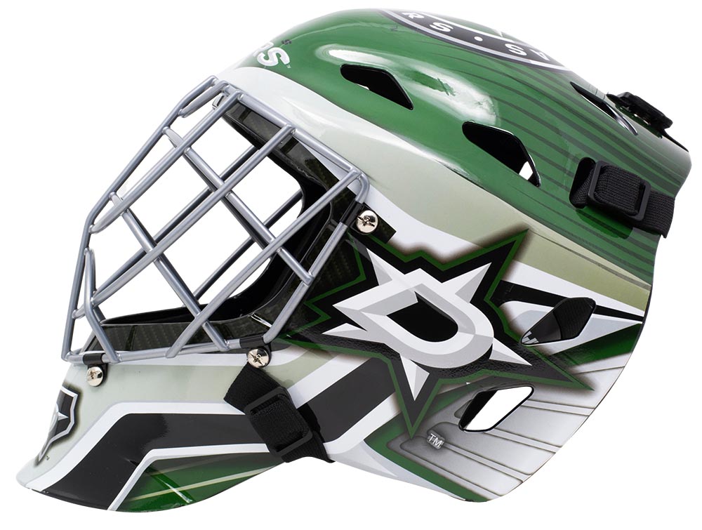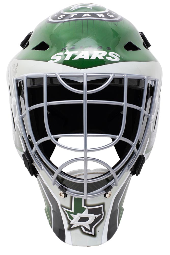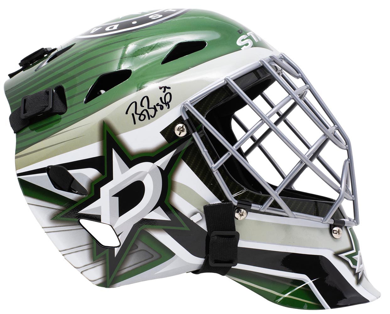 Dallas Stars Full-size replica goalie mask has been hand-signed in black felt-tip pen by Ben Bishop.