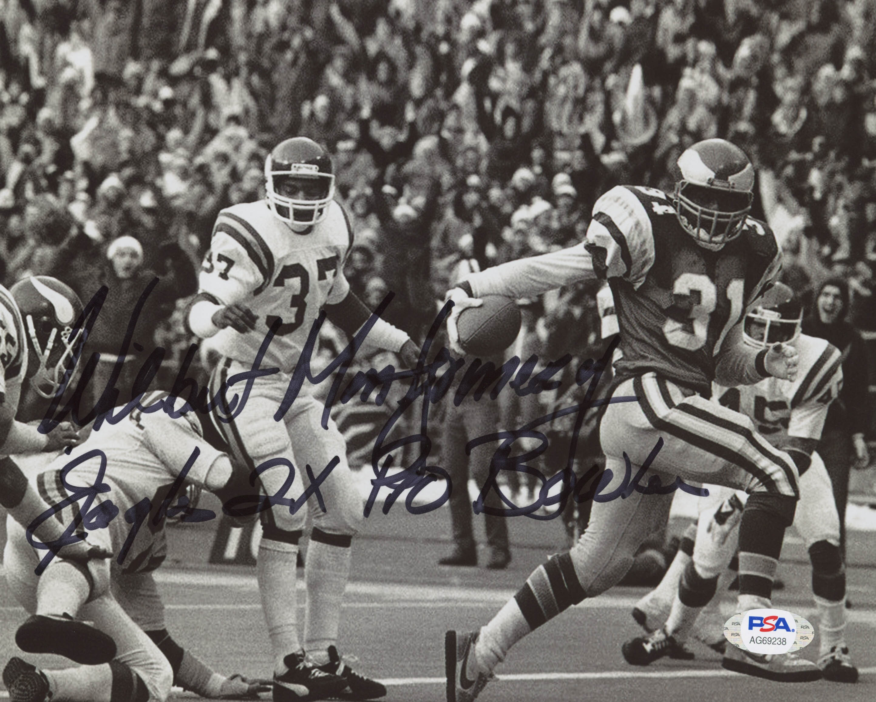 Photo measures 8" x 10" in size and has been hand-signed and inscribed in black felt-tip pen by Wilbert Montgomery (Philadelphia Eagles).