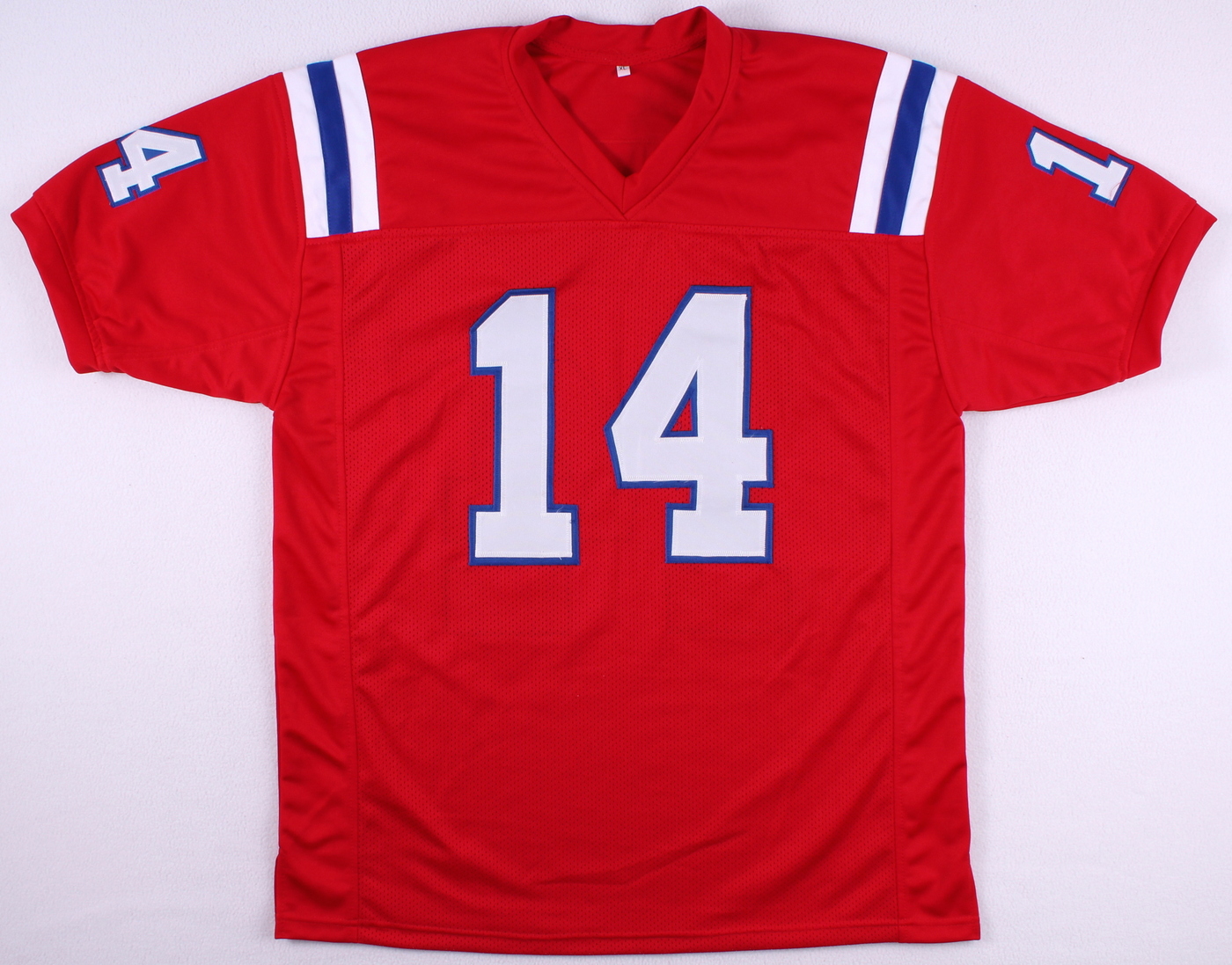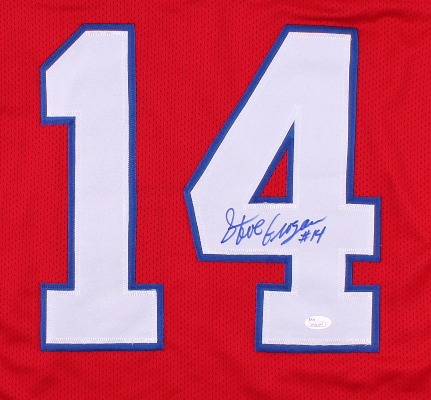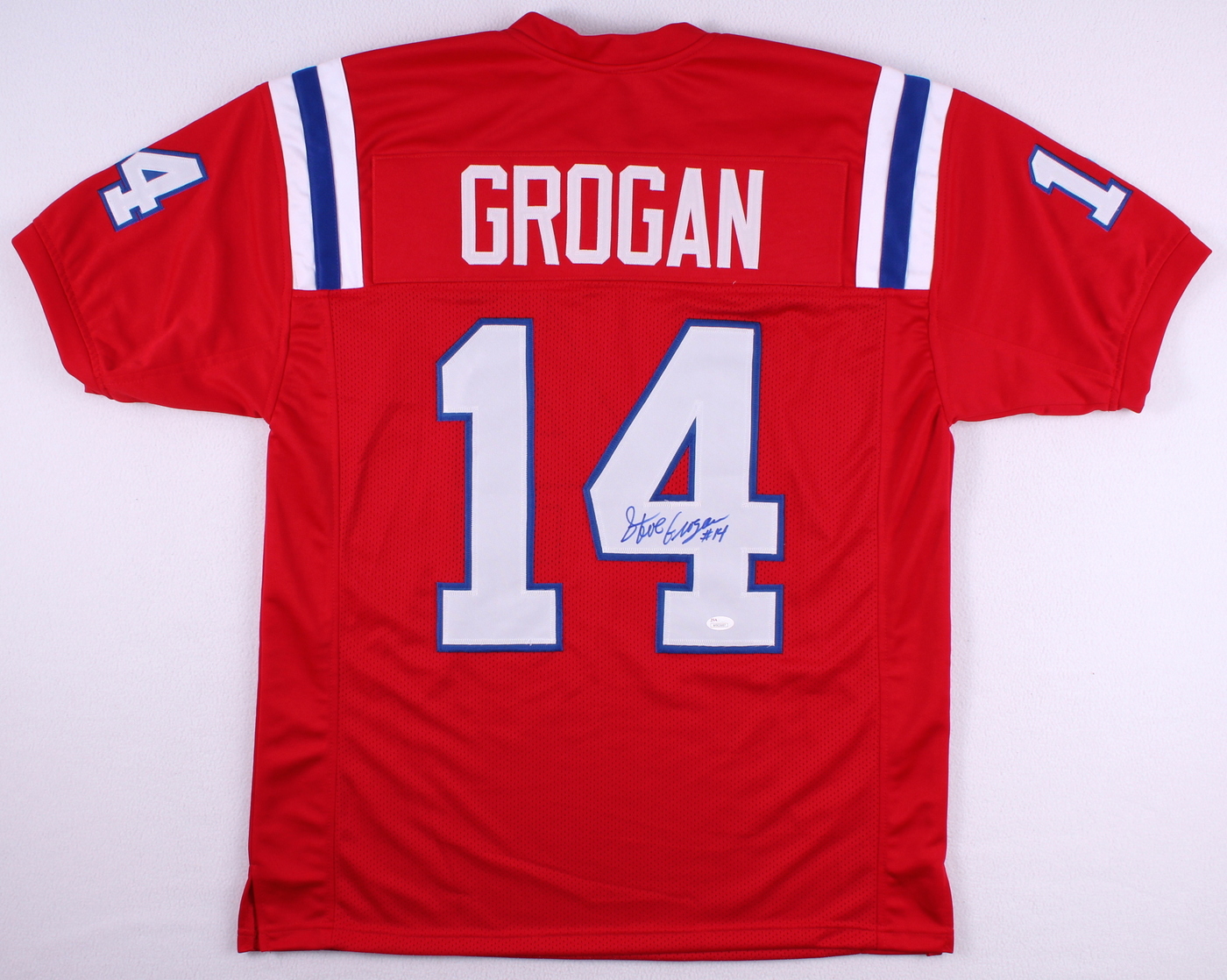 Custom on-field style jersey. Everything is sewn on, size XL. Hand-signed in blue felt-tip pen by Steve Grogan. The autograph includes an official James Spence Authentication (JSA) hologram and matching COA for authenticity purposes. The signing of this item was witnessed by JSA.