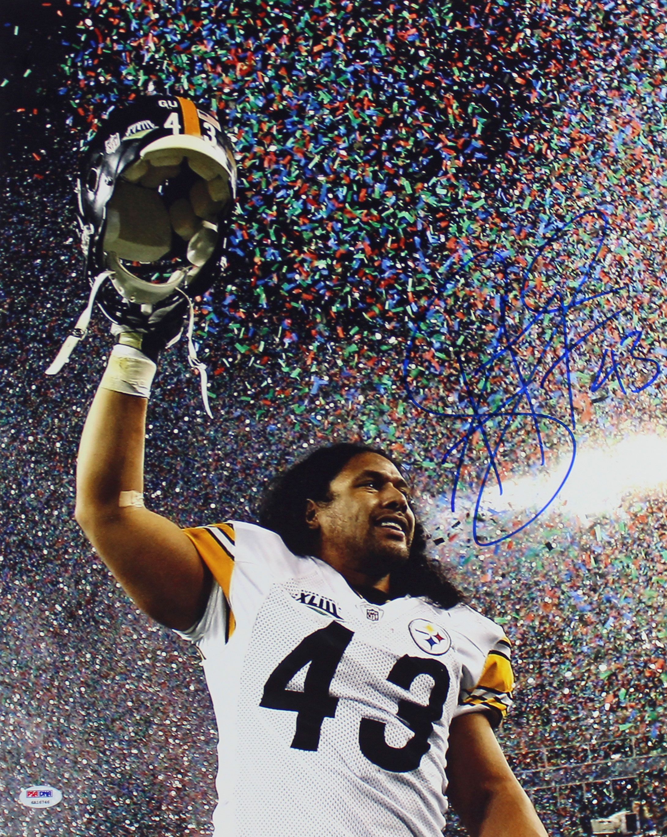 Photo measures 16" x 20" in size and has been hand-signed in blue felt-tip pen by Troy Polamalu (Pittsburgh Steelers, HOF).