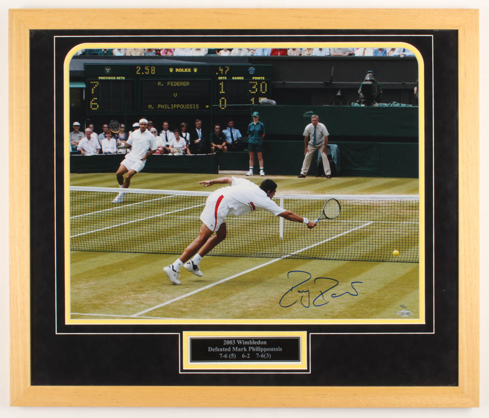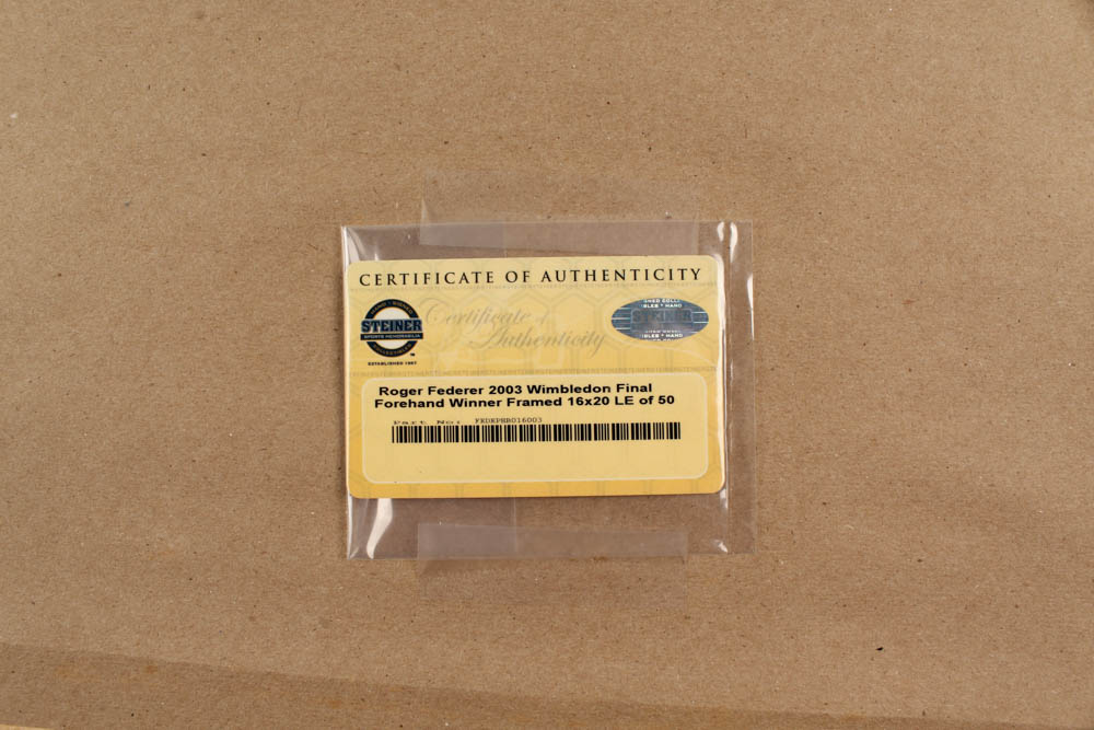 Custom framed display measures approximately 22" x 26" in size and features a photo that has been hand-signed in blue felt-tip pen by Roger Federer. Item is a limited edition #13/50.