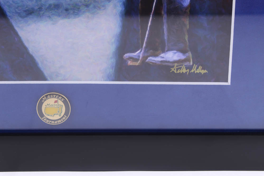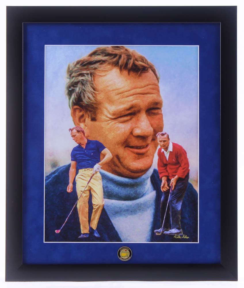 Custom frame measures 16" x 19" in size and features a print of Arnold Palmer (D. 2015, HOF). Display also features a Masters Tournament ball marker.