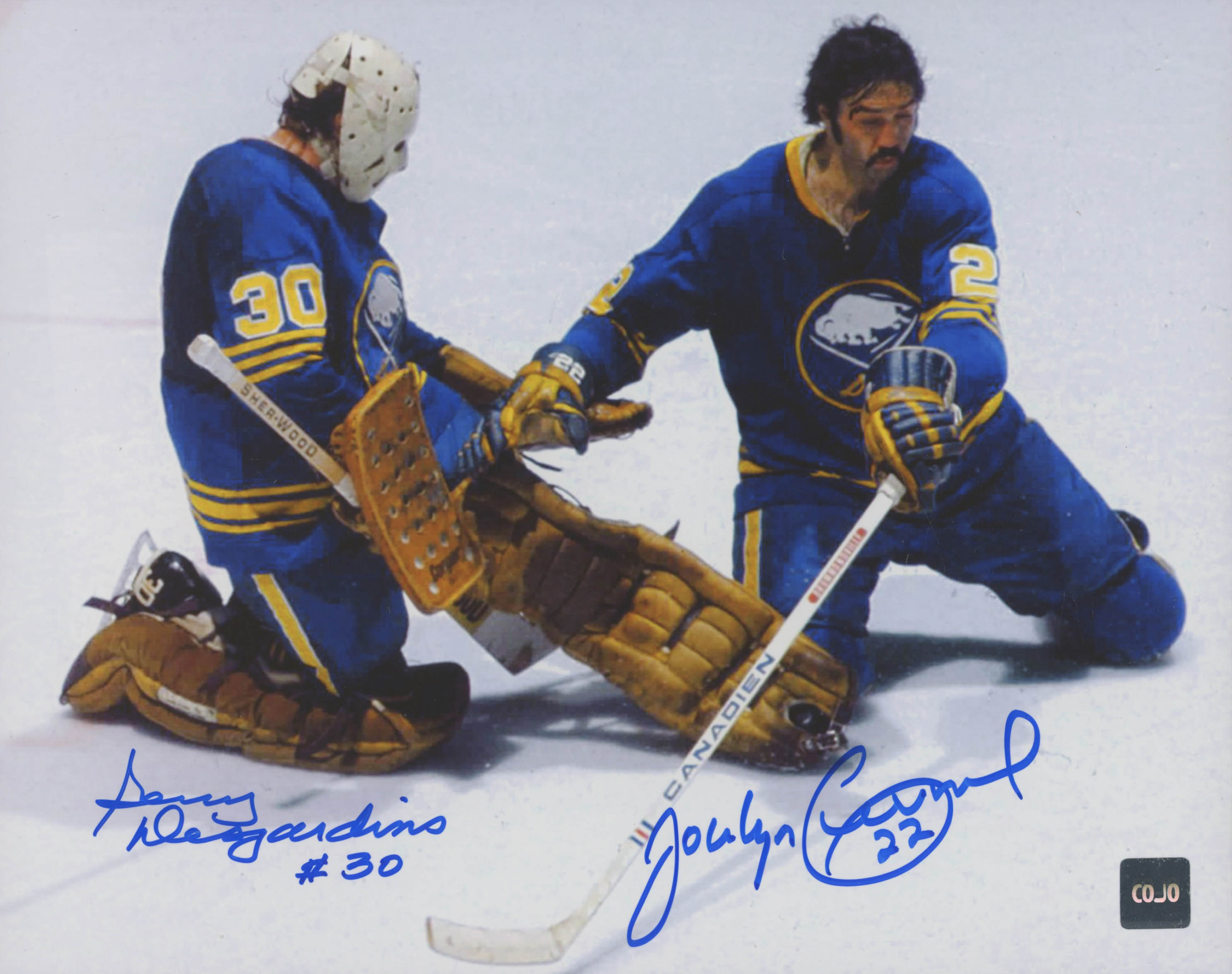 Photo measures 8" x 10" in size and has been hand-signed in blue felt-tip pen by Gerry Desjardins (Buffalo Sabres) and Jocelyn Guevremont (Buffalo Sabres).