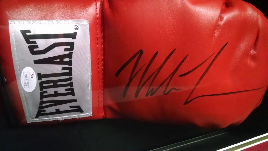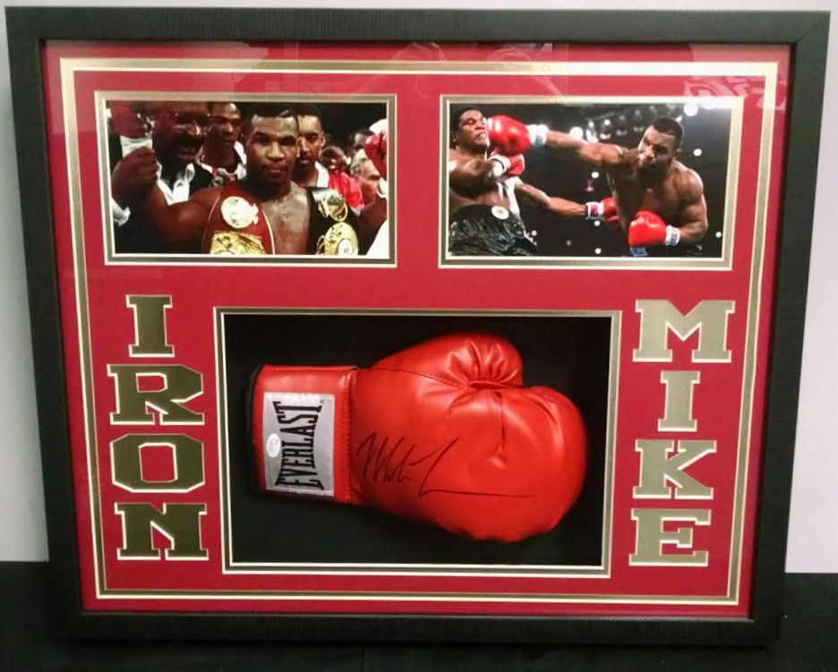 Shadowbox display measures approximately 21" x 25" x 4" in size and features a glove which has been hand-signed in black felt-tip pen by Mike Tyson. The autograph includes an official James Spence Authentication (JSA) hologram for authenticity purposes. The signing of this item was witnessed by JSA.