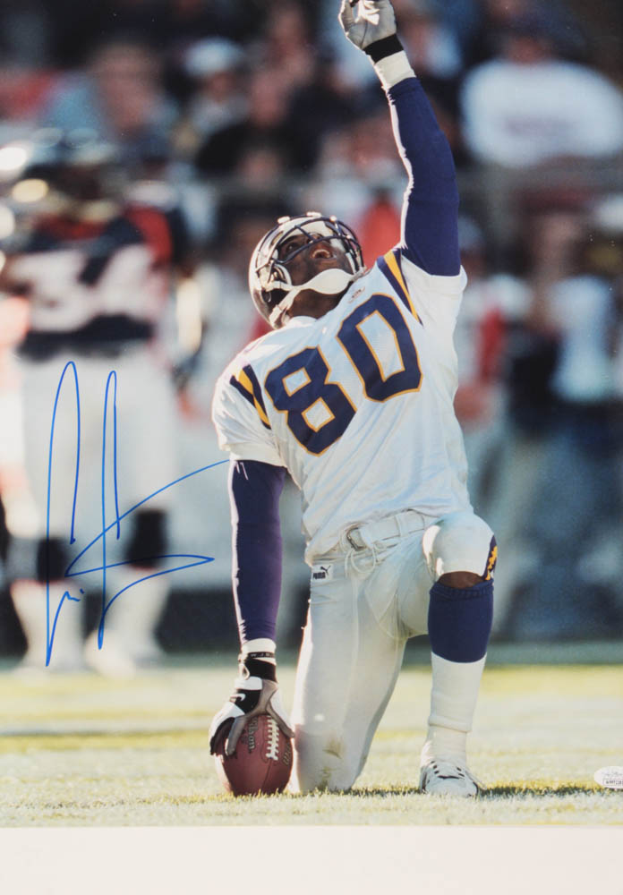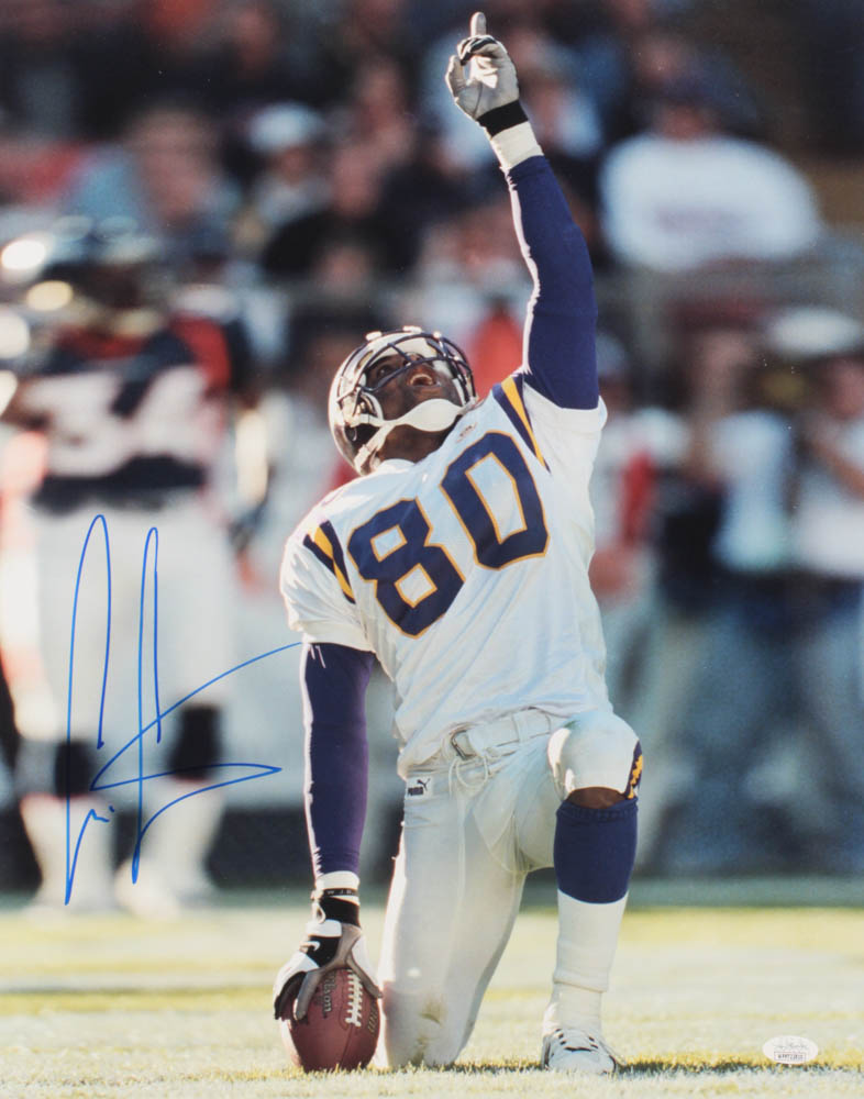 Photo measures 16" x 20" in size and has been hand signed in blue felt tip pen by Cris Carter (Minnesota Vikings, HOF).