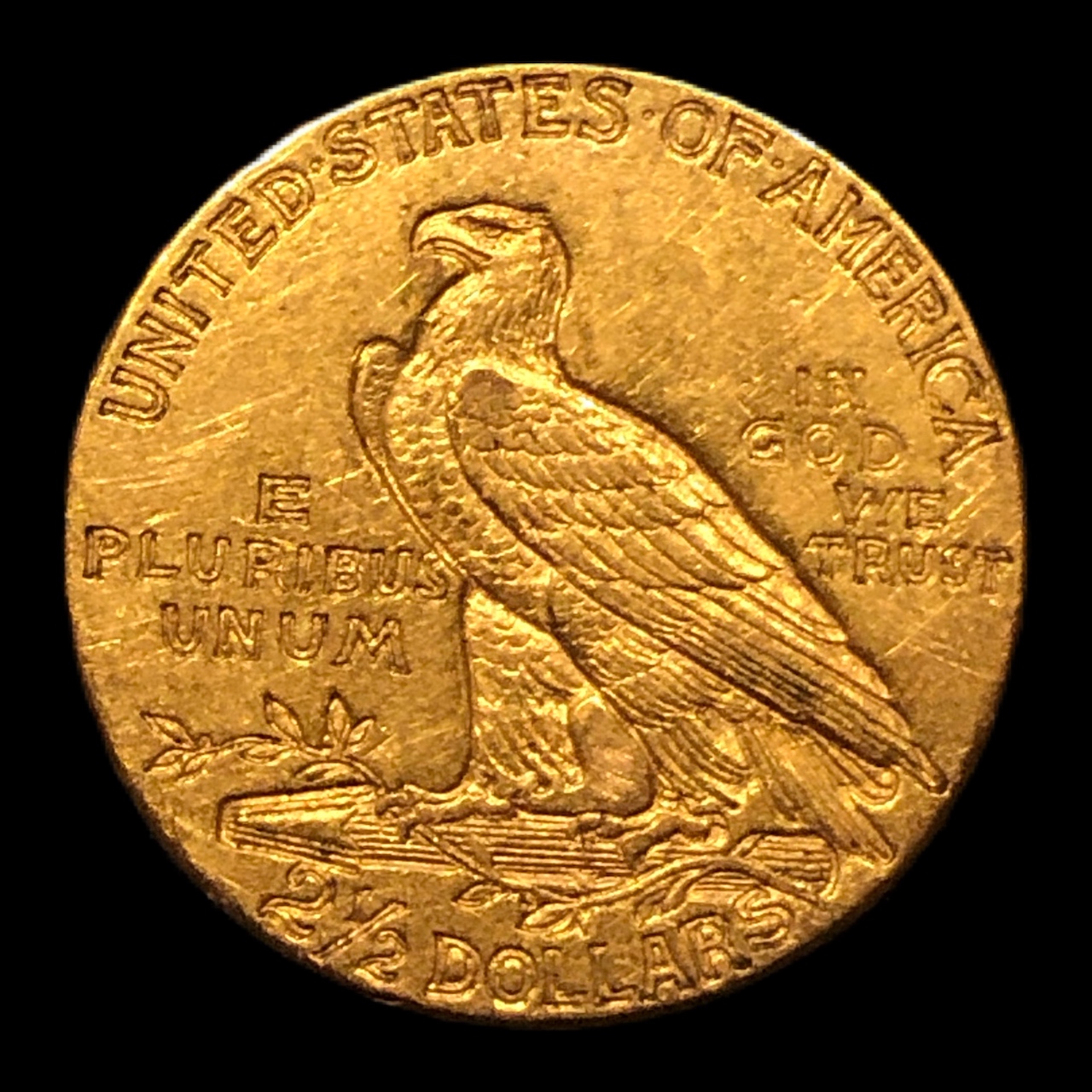Designed by Bela Lyon Pratt, a student of Augustus Saint-Gaudens, the $2.50 Indian features legends and motifs that are incused rather than raised on the coin, making them one of only two U.S. coins minted in this manner. The obverse features a stoic Indian chief profile, surrounded by 13 small stars and the word "Liberty" along with the date. The reverse shows a regal bald eagle with a cluster of arrows and an olive branch, symbolic of war and peace, beneath the eagle’s talons.