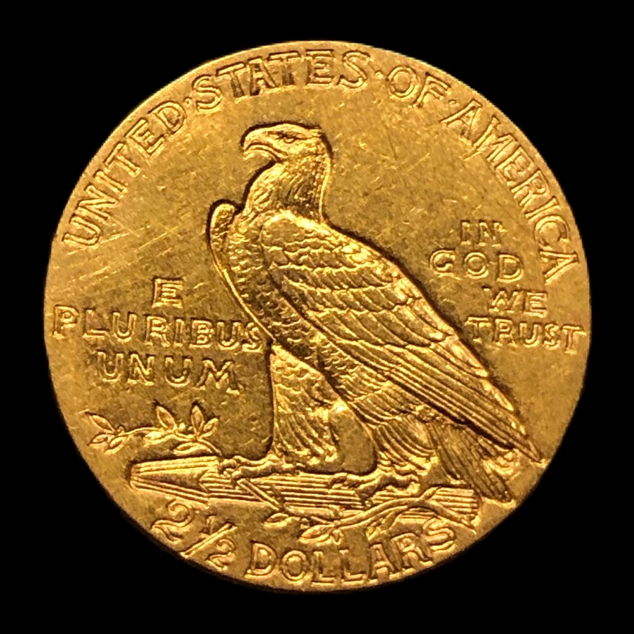 Designed by Bela Lyon Pratt, a student of Augustus Saint-Gaudens, the $2.50 Indian features legends and motifs that are incused rather than raised on the coin, making them one of only two U.S. coins minted in this manner. The obverse features a stoic Indian chief profile, surrounded by 13 small stars and the word "Liberty" along with the date. The reverse shows a regal bald eagle with a cluster of arrows and an olive branch, symbolic of war and peace, beneath the eagle’s talons.