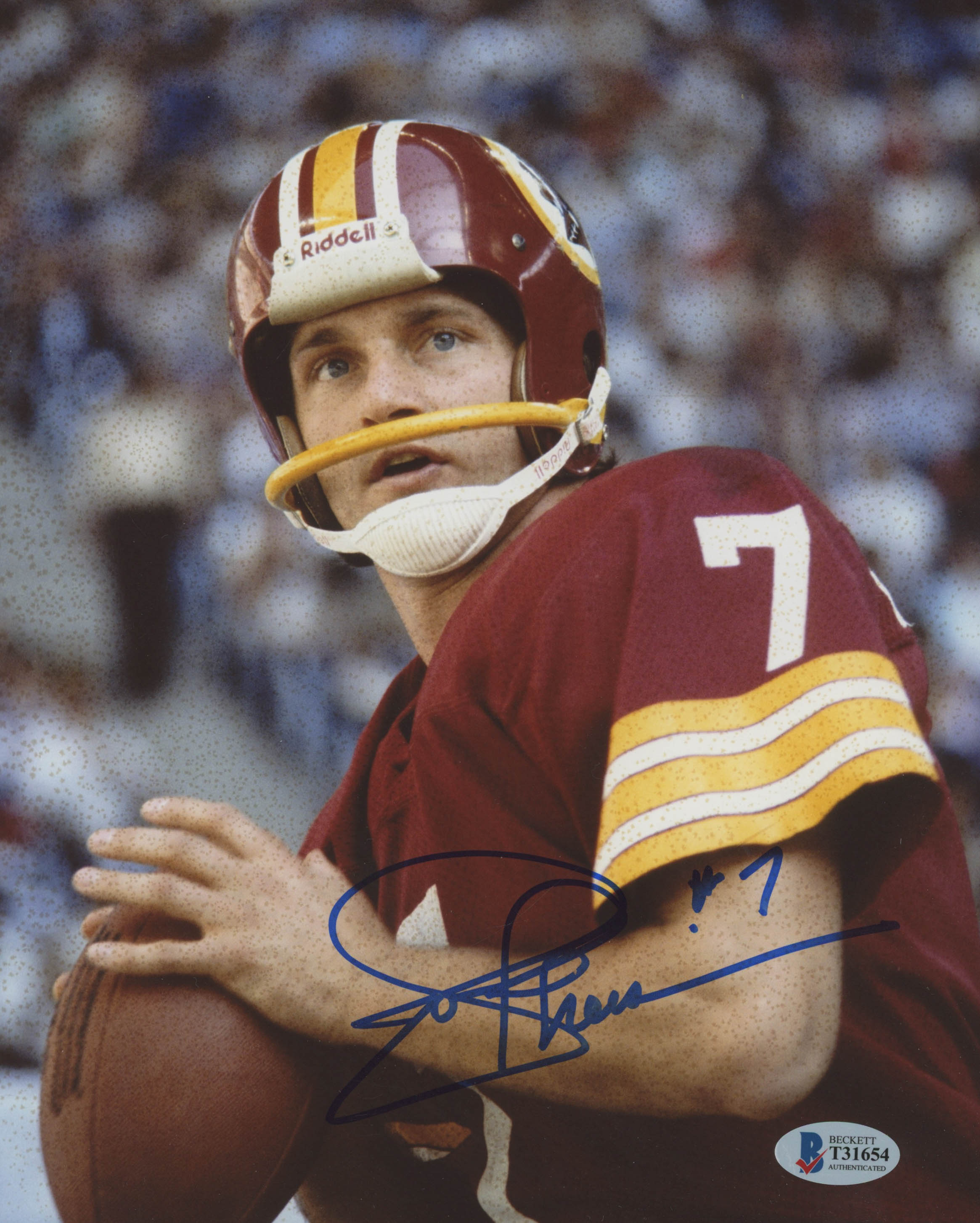 Photo measures 8" x 10" in size and has been hand-signed in blue felt-tip pen by Joe Theismann (Washington Redskins).