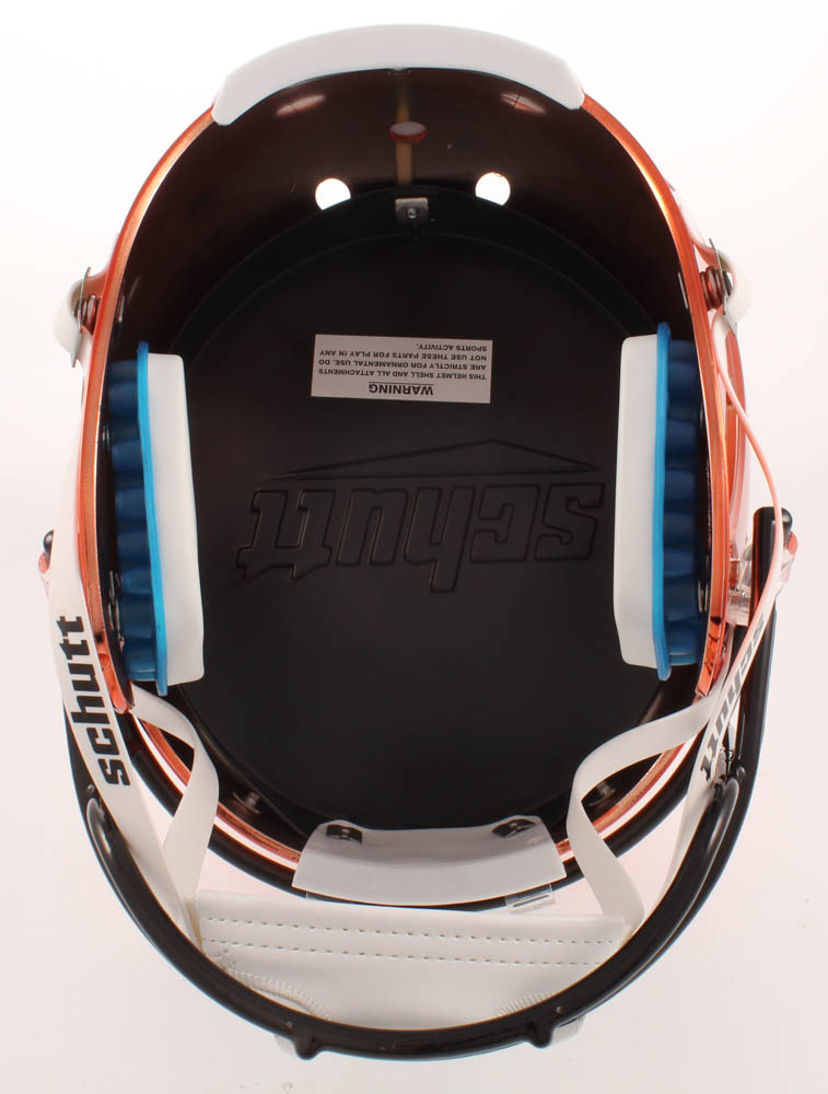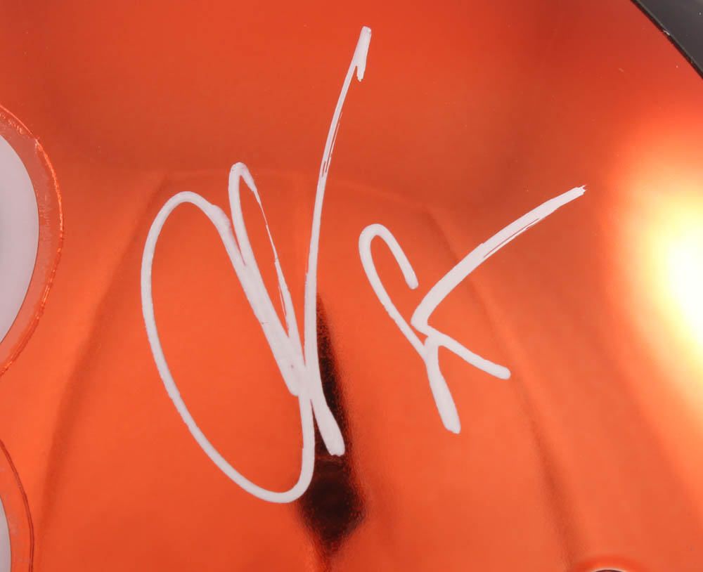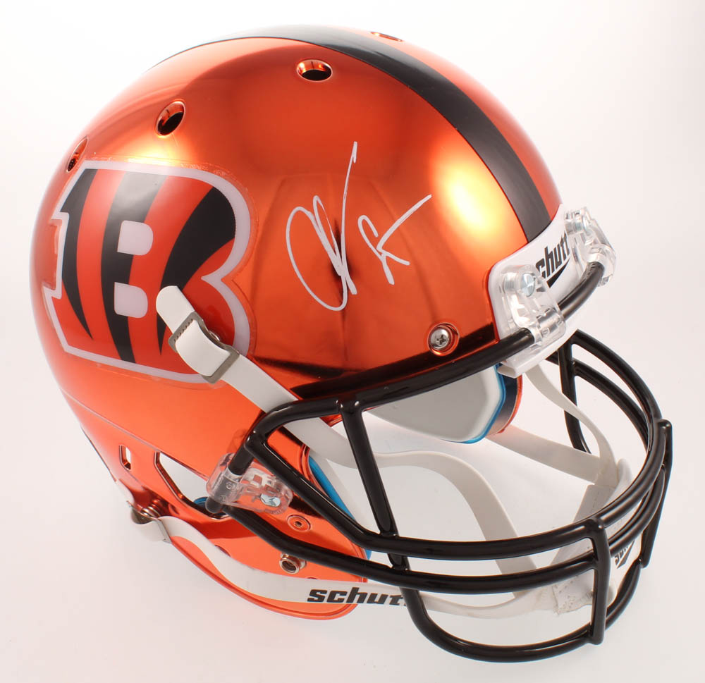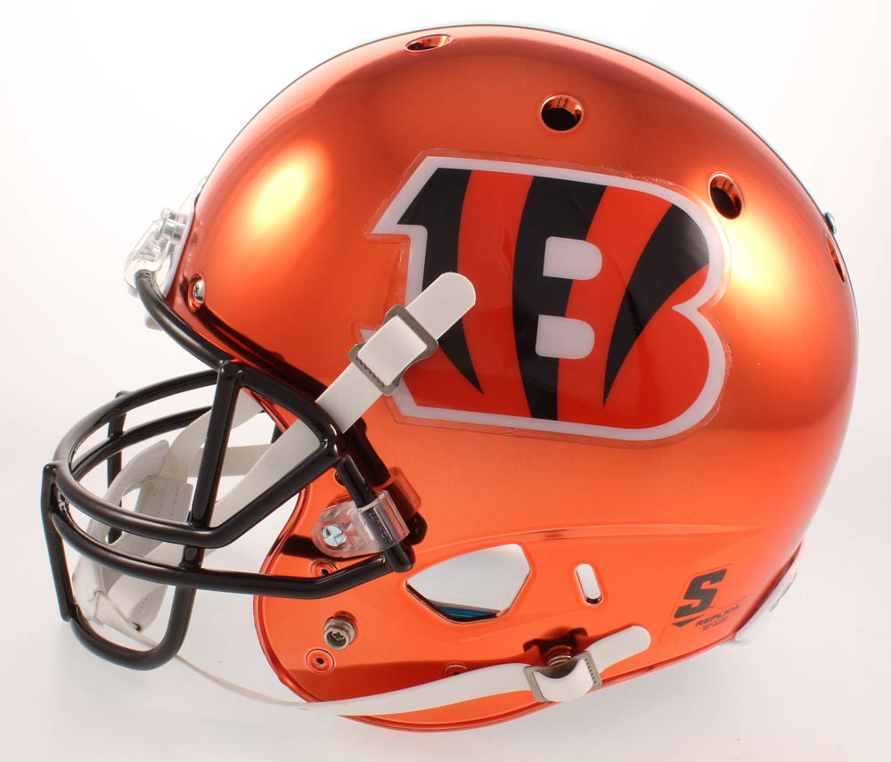 Schutt Cincinnati Bengals full-size replica chrome helmet. Hand-signed in white paint pen by Chad Johnson.
