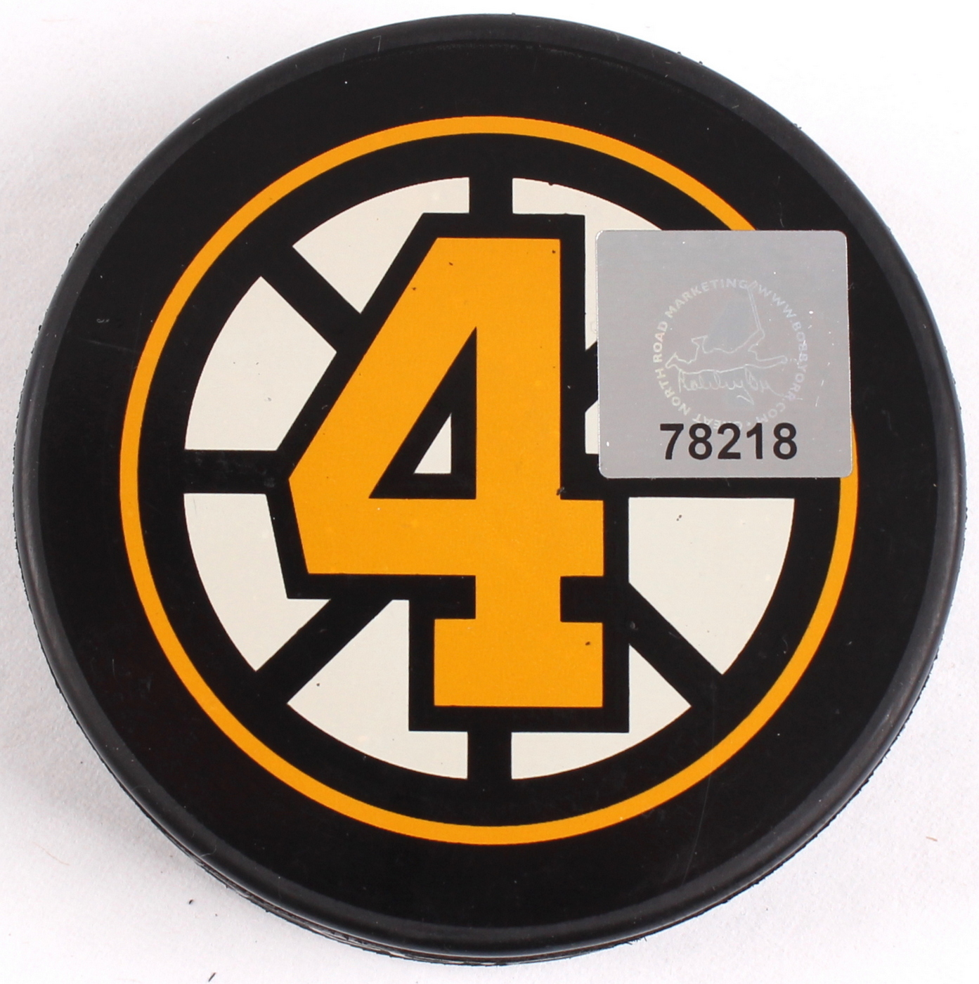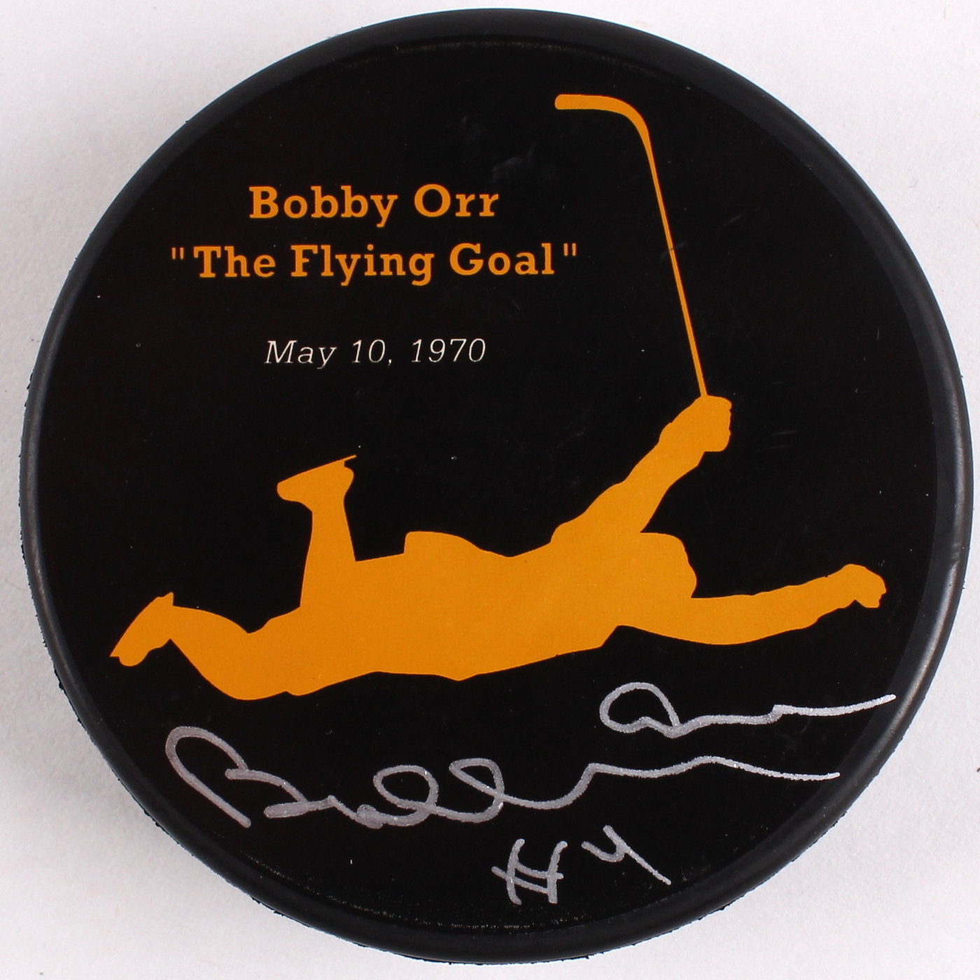 Hockey puck commemorates one of the most iconic moments in all of sports. The puck is hand-signed by Bobby Orr (Boston Bruins, HOF).