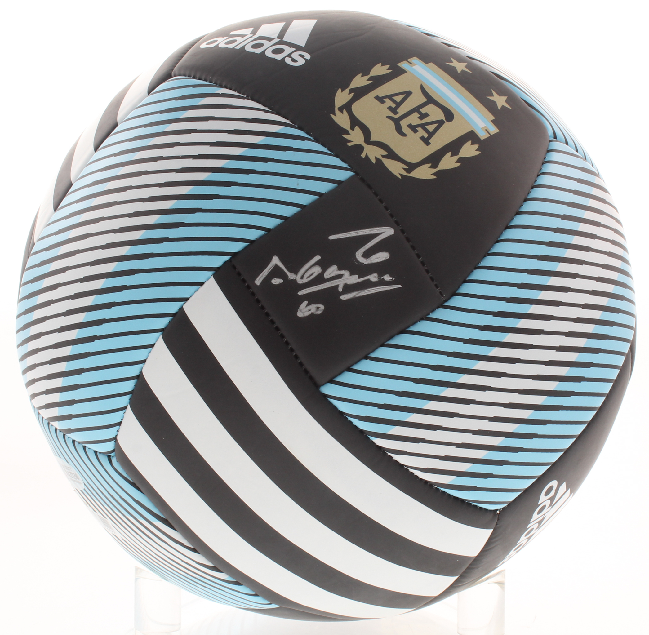 Adidas soccer ball has been hand-signed in silver paint pen by Sergio Aguero.