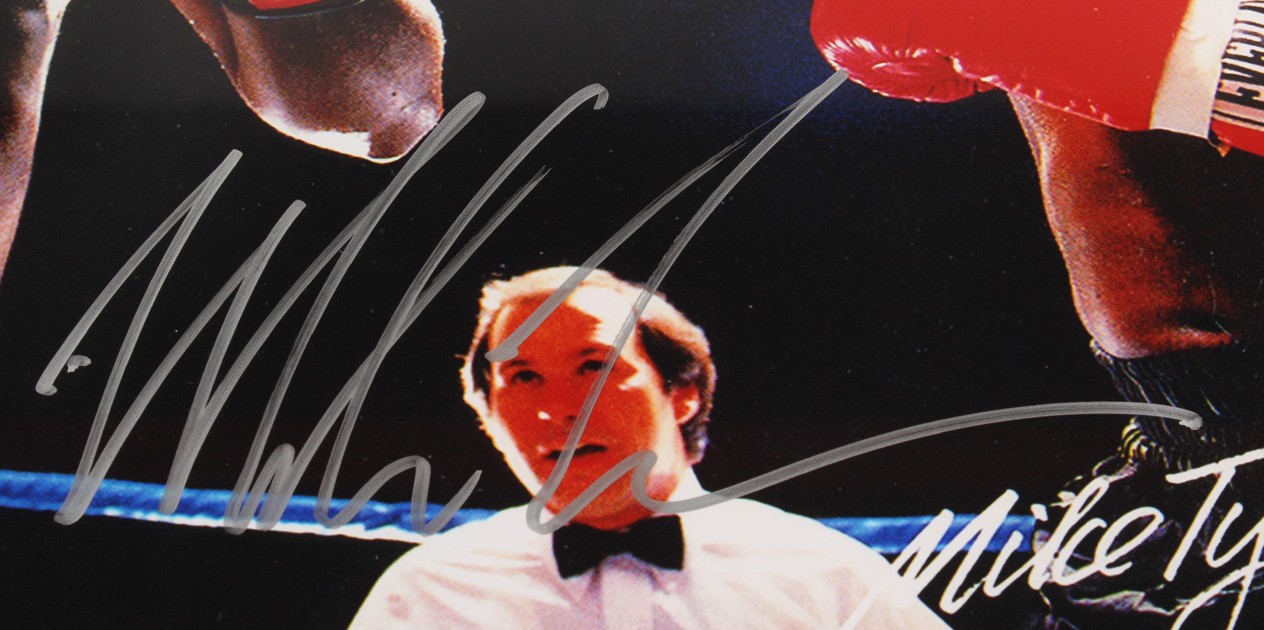 Custom framed photo display measures 18" x 22" in size and has been hand-signed in silver paint pen by Mike Tyson. (HOF) Display also features a replica controller.