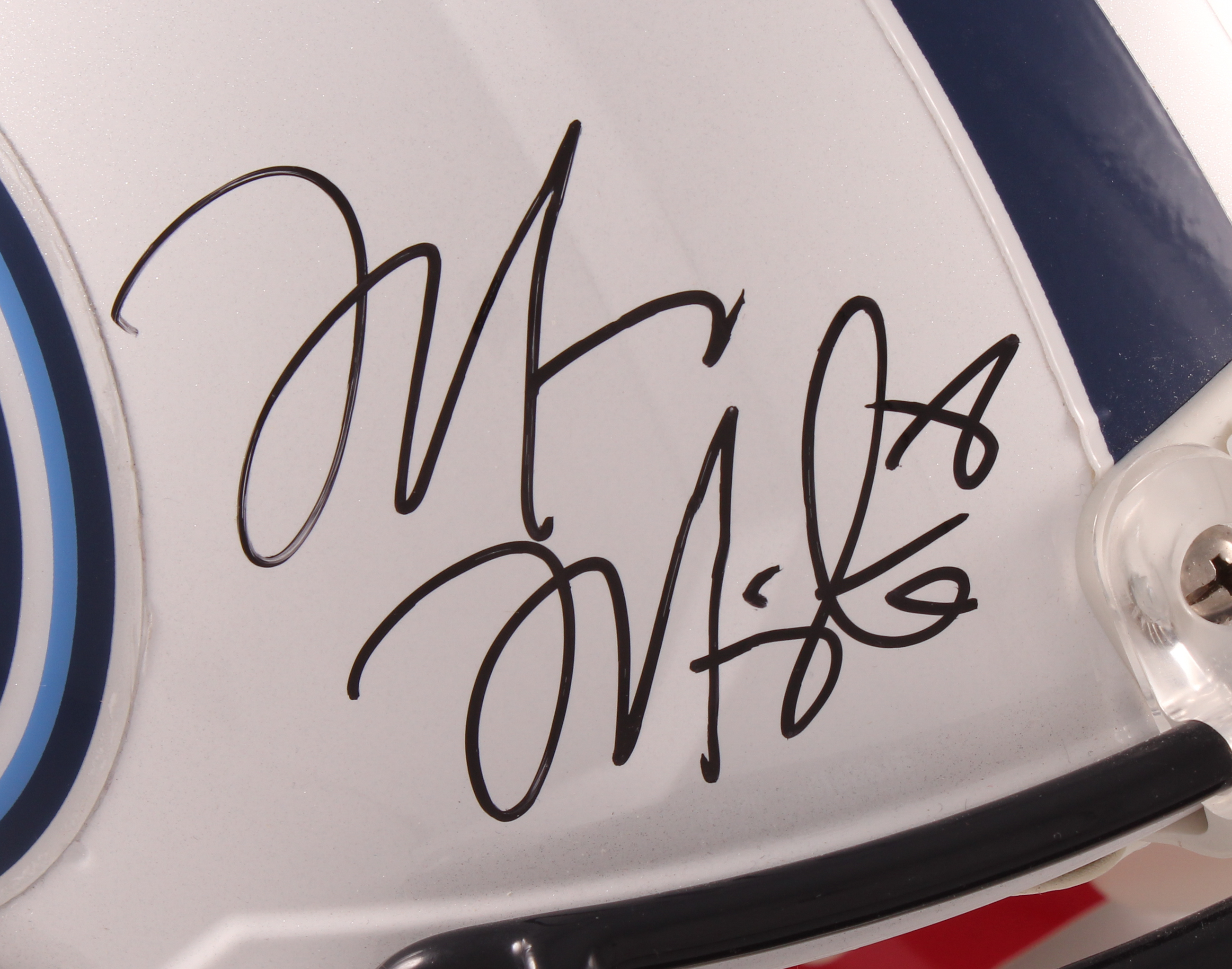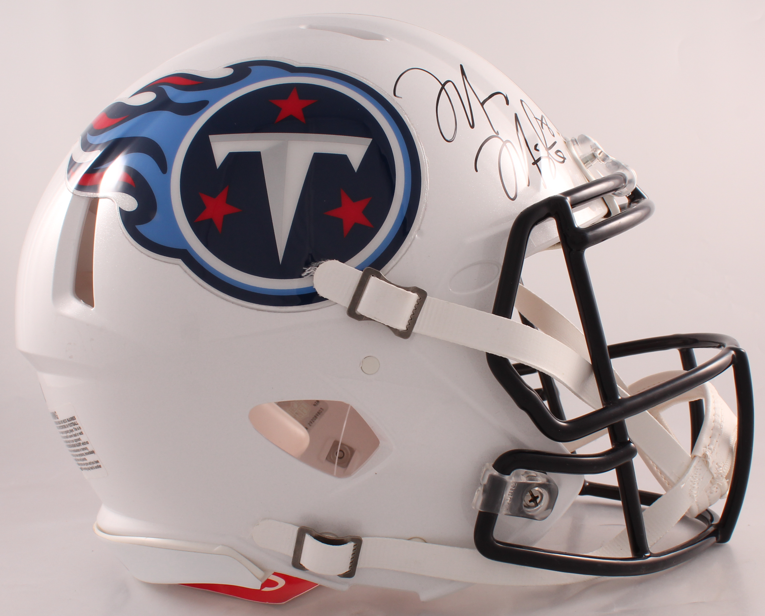 Riddell Tennessee Titans full-size authentic on-field speed helmet. Hand-signed in black felt-tip pen by Marcus Mariota (Tennessee Titans).