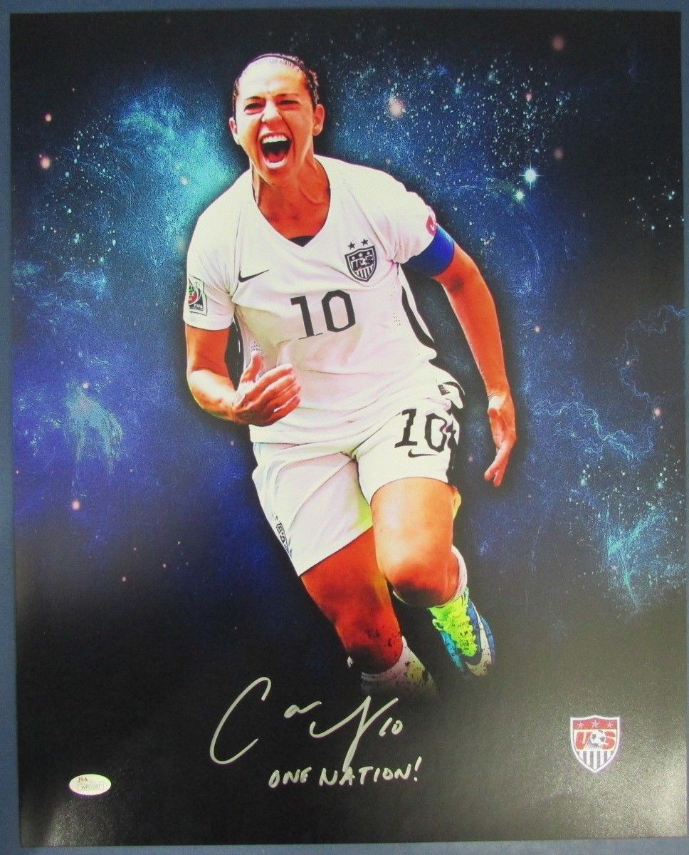 Photo measures 16" x 20" in size and has been hand-signed in silver paint pen by Carli Lloyd.