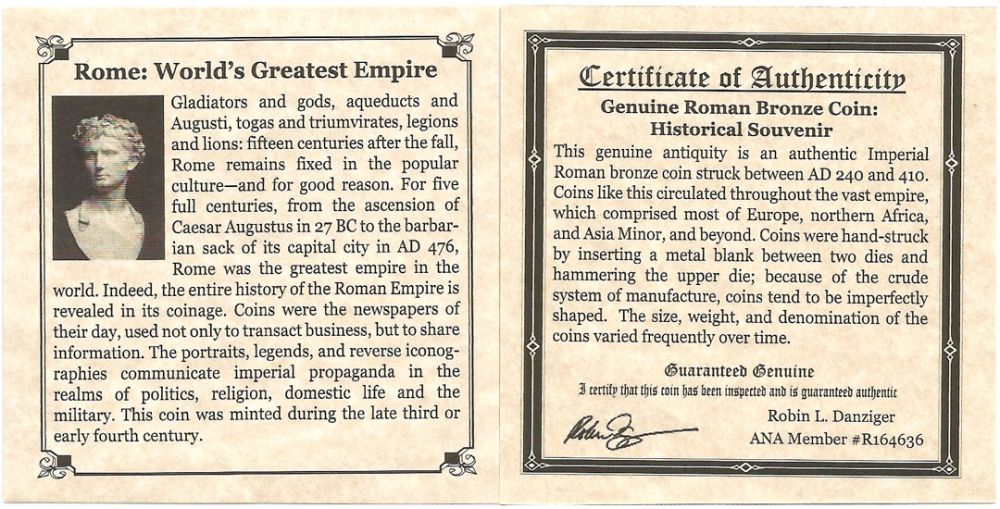 For five full centuries, from the ascension of Caesar Augustus in 27 BC to the barbarian sack of its capital city in AD 476, Rome was the greatest empire in the world. This genuine antiquity is an authentic Imperial Roman bronze coin struck between AD 240 and 410.