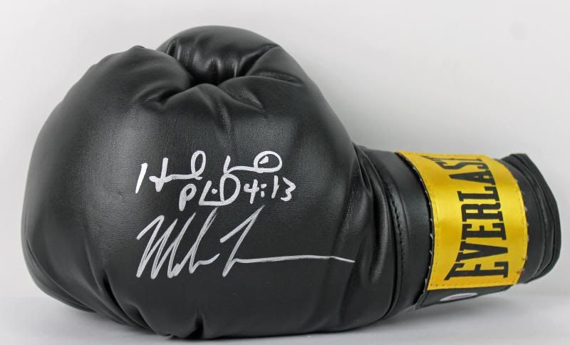 Everlast boxing glove has been hand-signed in silver paint pen by Mike Tyson (HOF) and Evander Holyfield.