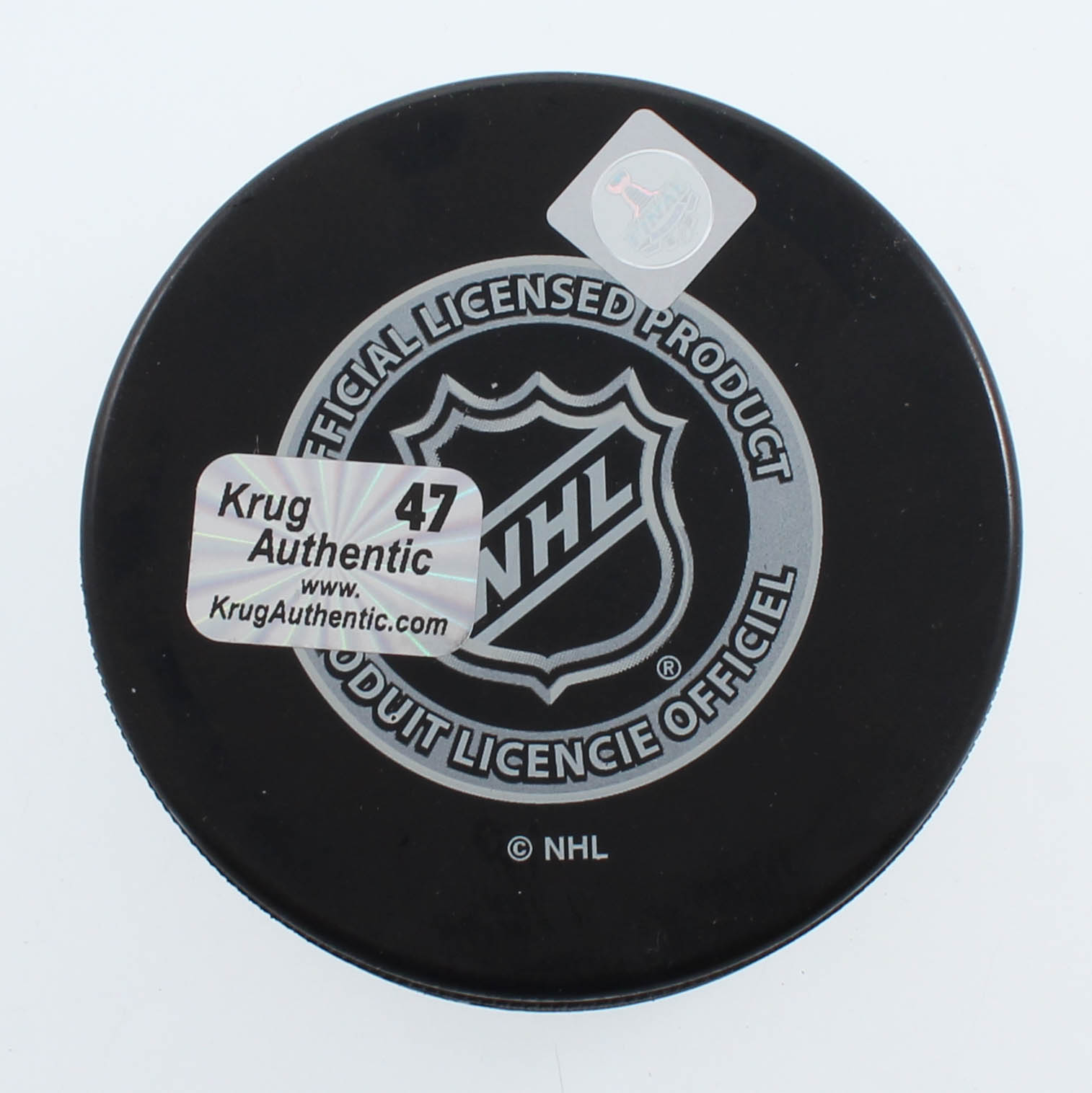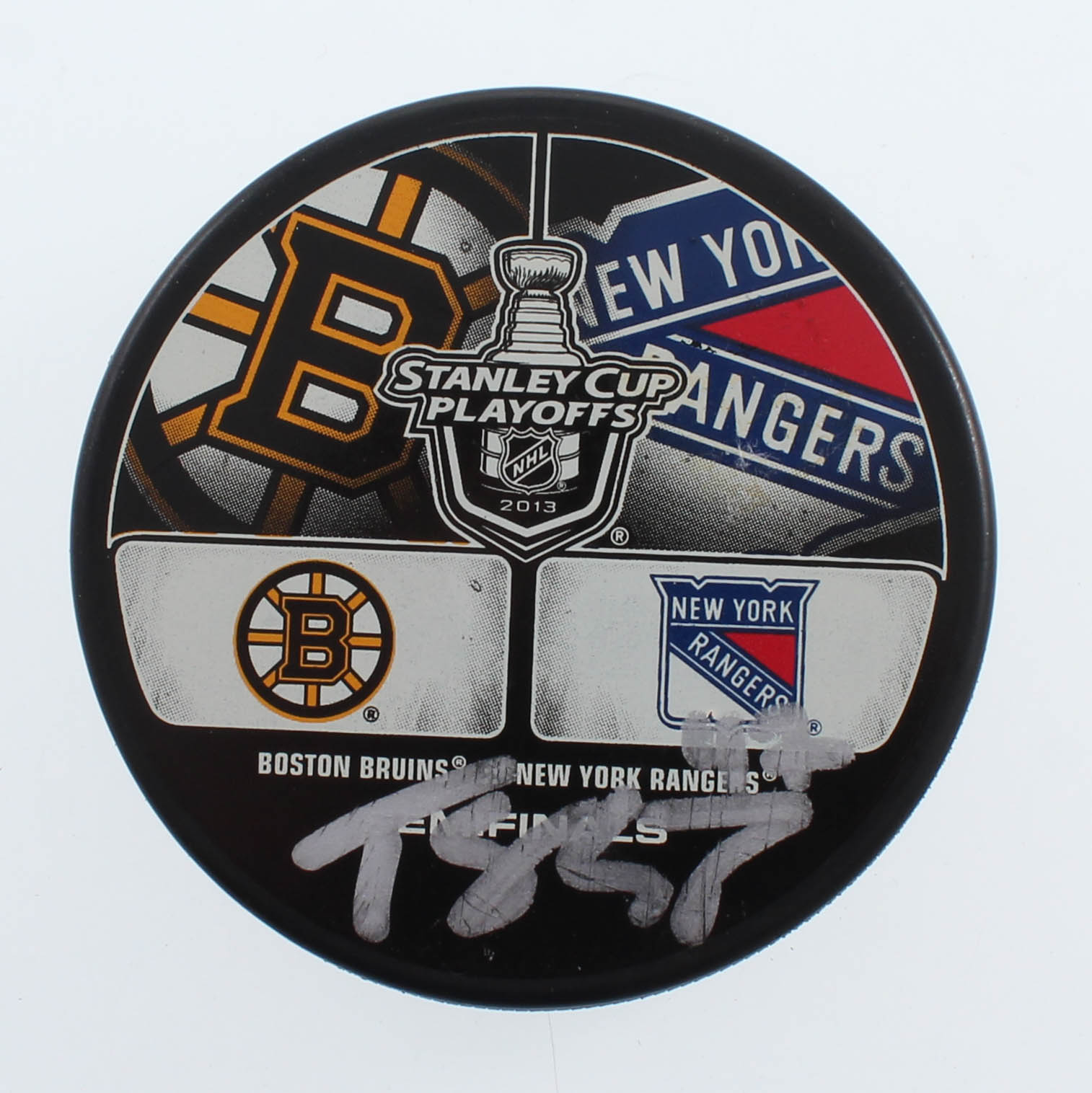 2013 Stanley Cup Playoffs logo hockey puck. Hand-signed in silver paint pen by Torey Krug (Boston Bruins).