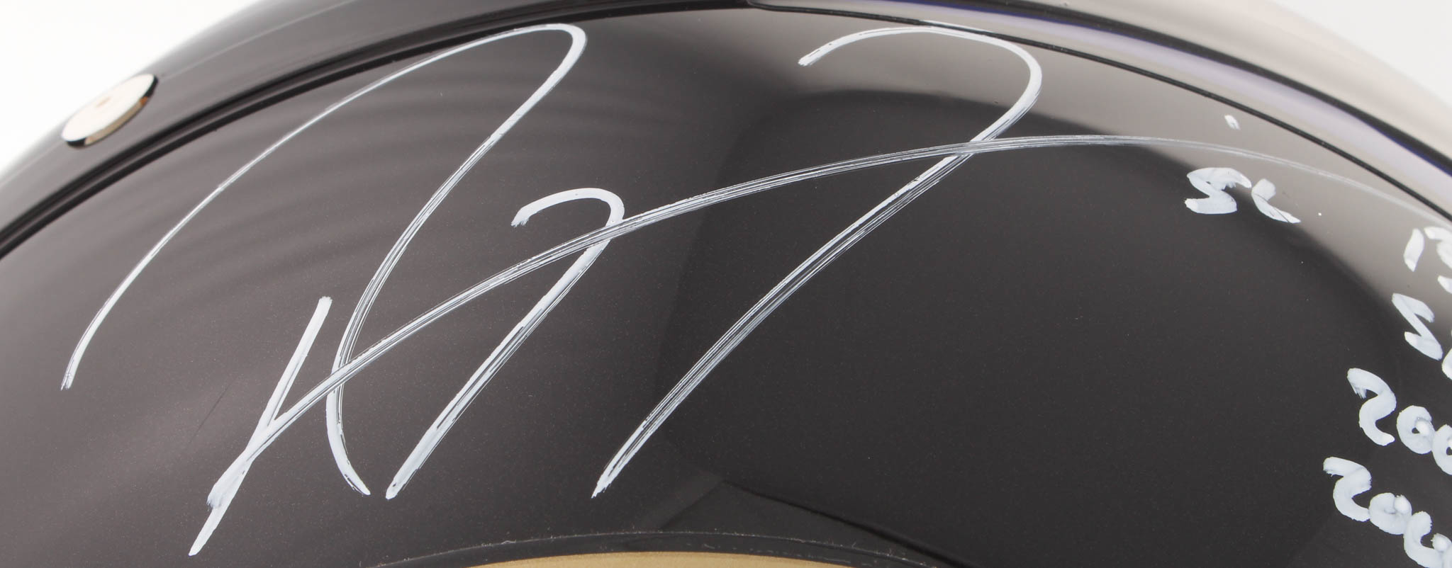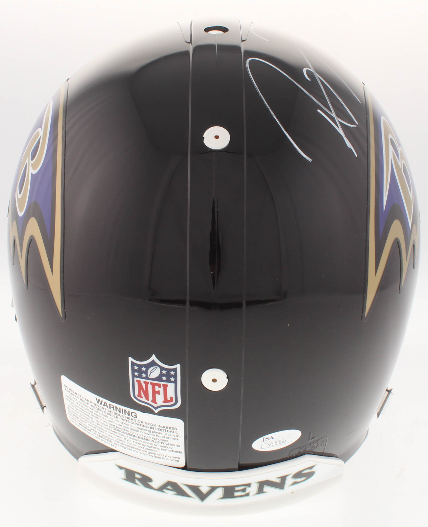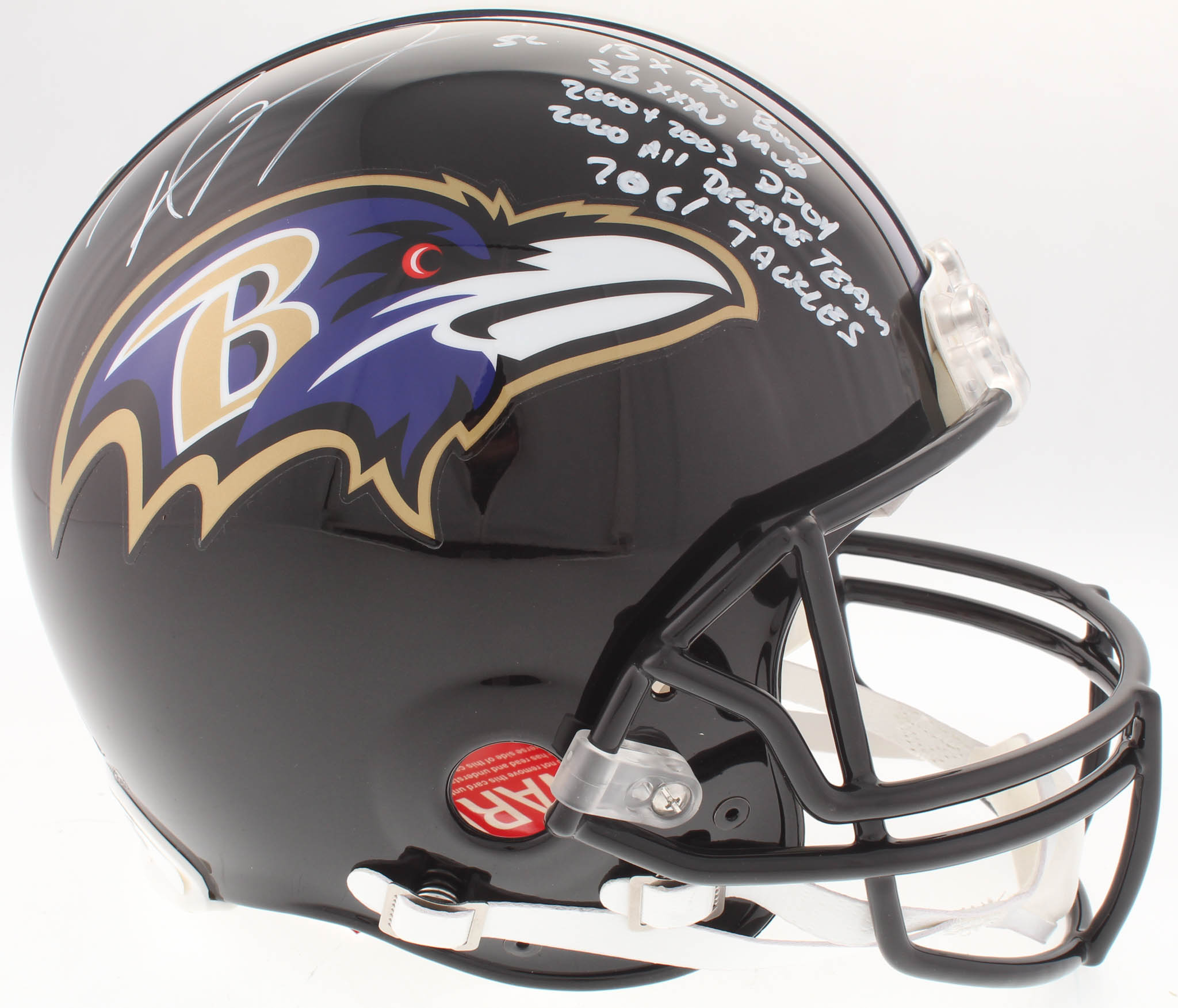 Riddell Baltimore Ravens authentic on-field full-size replica helmet. Hand-signed and inscribed by Ray Lewis (HOF).