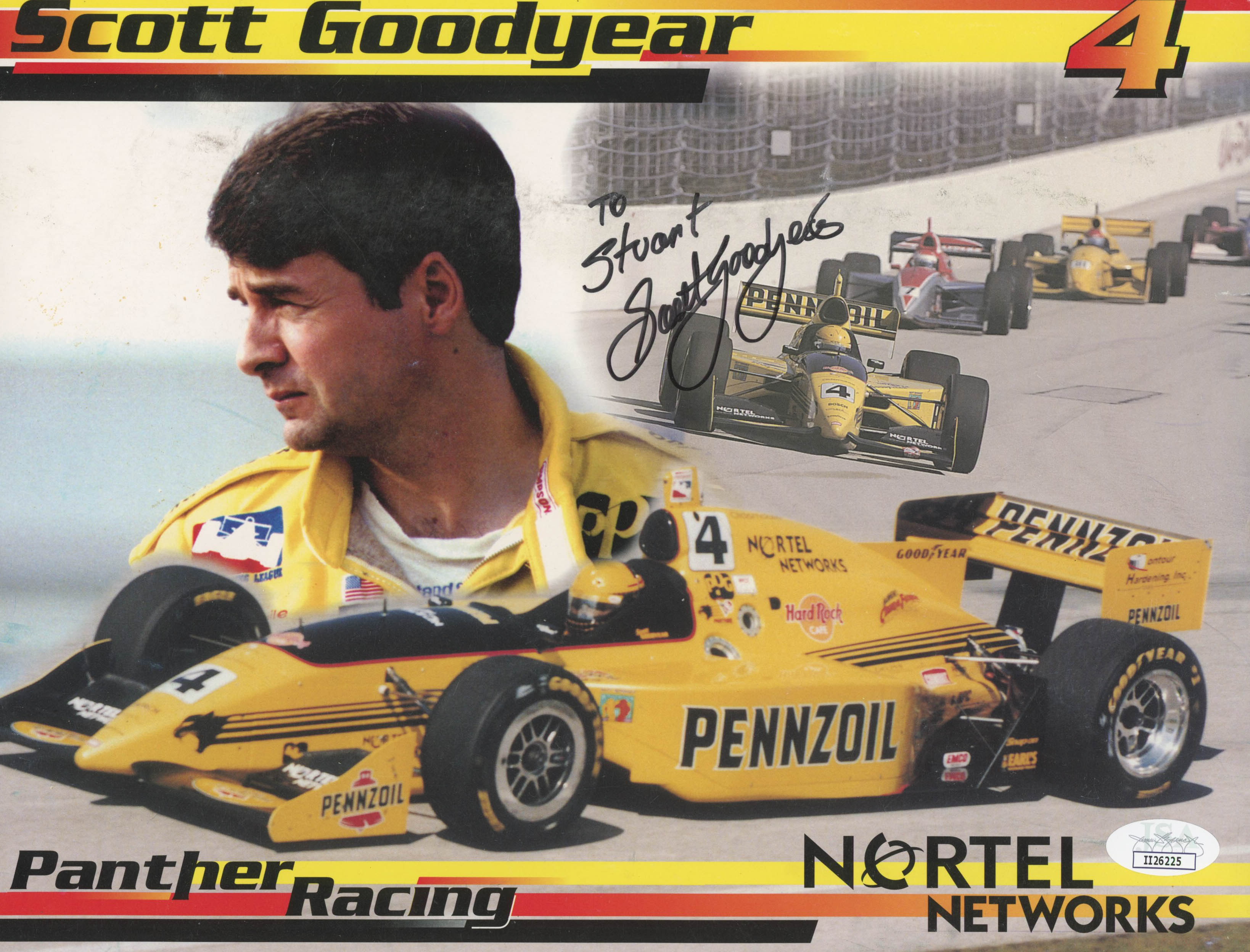 Photo measures 8.5" x 11" in size and has been hand-signed in black felt-tip pen by Scott Goodyear. Please note, the item has been personalized "To Stuart".