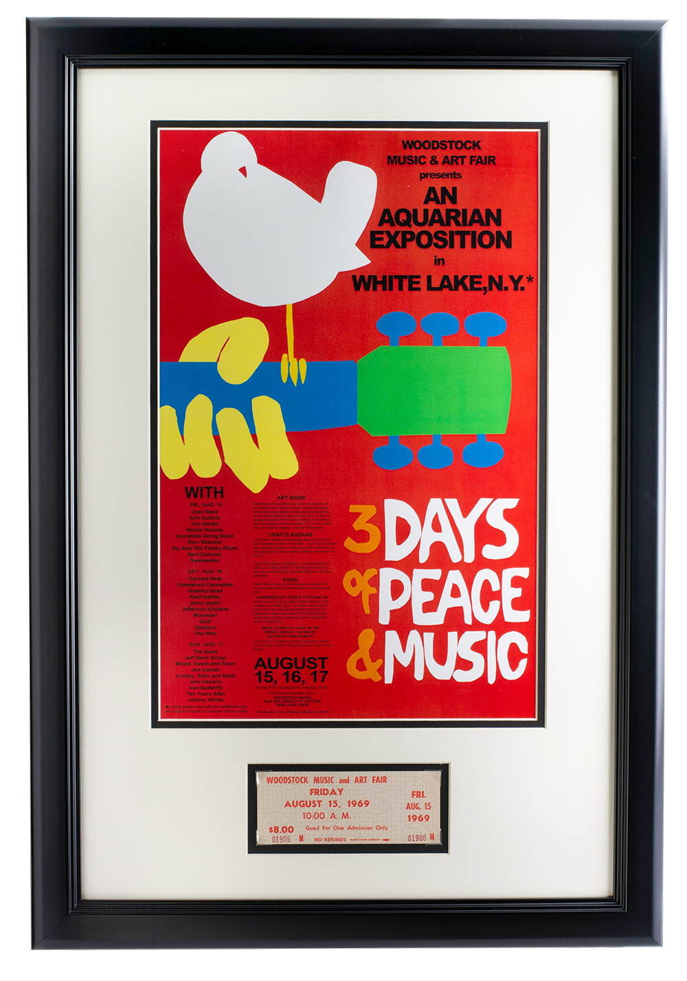 Custom frame measures 16" x 23" in size and features a vintage Woodstock poster. Display also features an original Friday Woodstock ticket.