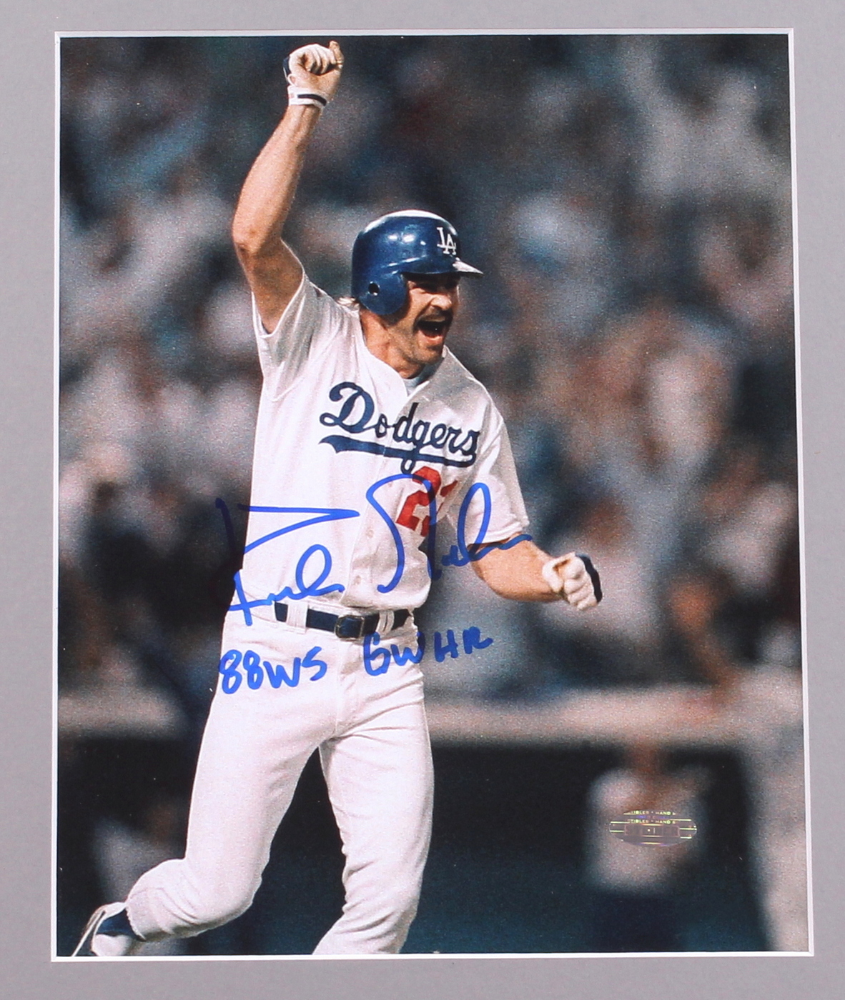 Custom framed photo display measures 13" x 15" in size. Features a photo that has been hand signed and inscribed in blue felt-tip pen by Kirk Gibson (Tigers). The autograph includes an official Steiner hologram and matching COA for authenticity purposes.