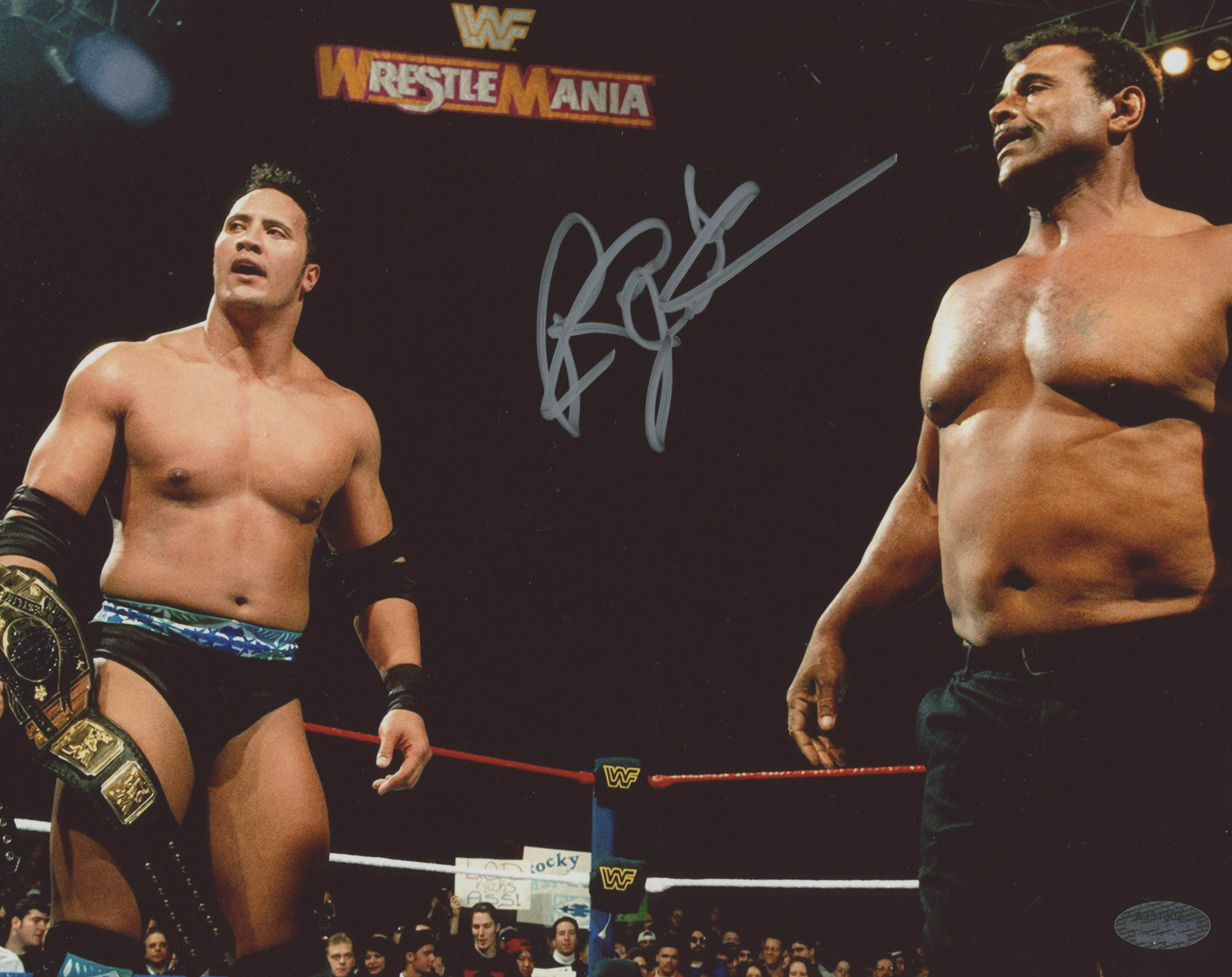 Photo measures 8" x 10" in size and has been hand-signed in silver paint pen by Rocky Johnson (D. 2020).
