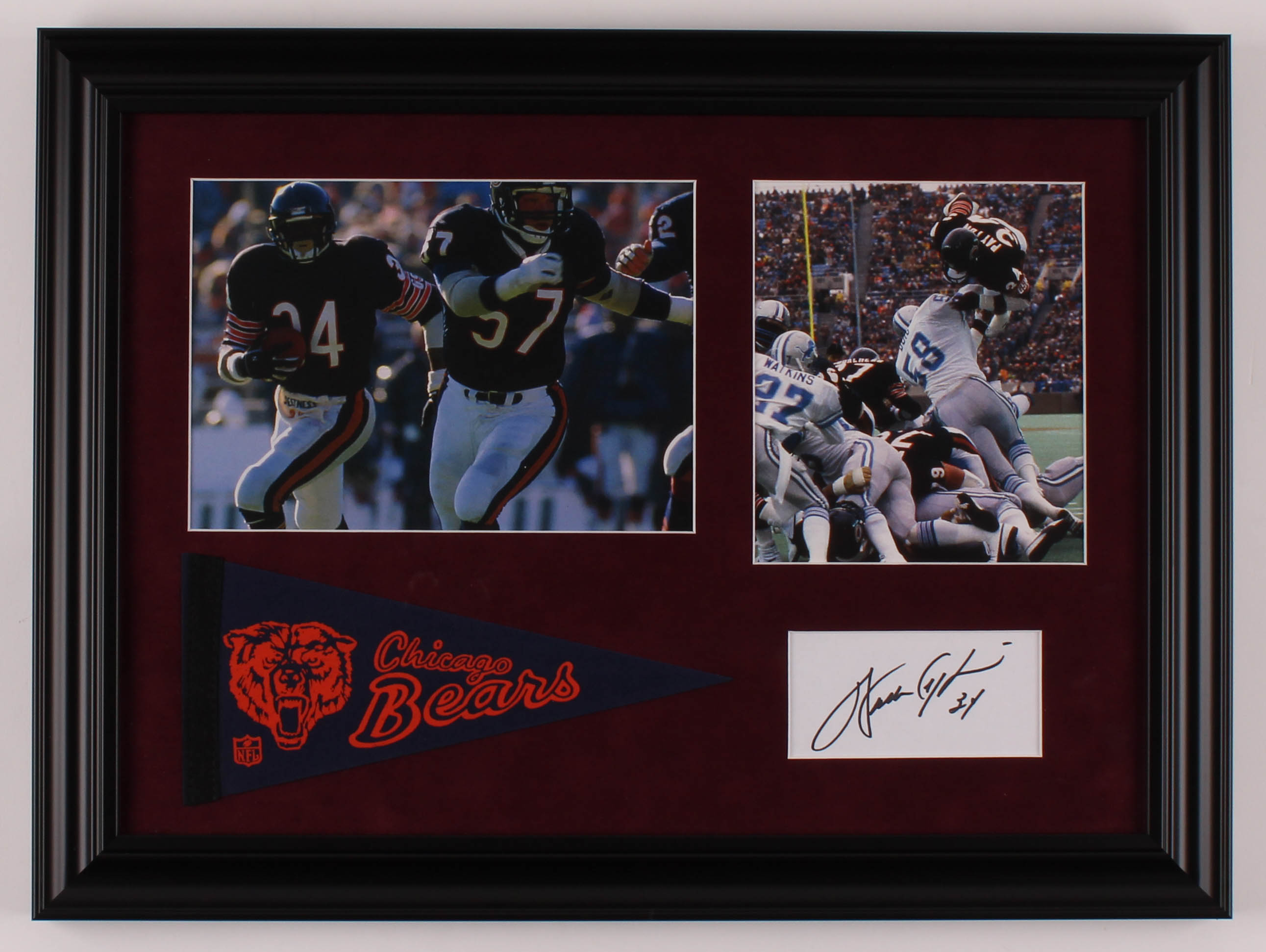 Custom framed cut display measures 15" x 20" in size and has been hand signed in black felt tip pen by Walter Payton (D. 1999, Chicago Bears, HOF). Display also includes (2) 8" x 10" photos of payton as well as (1) Chicago Bears mini pennant flag.
