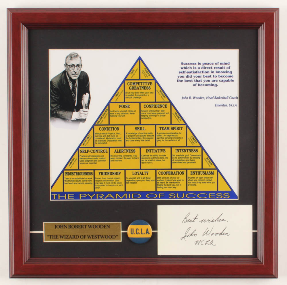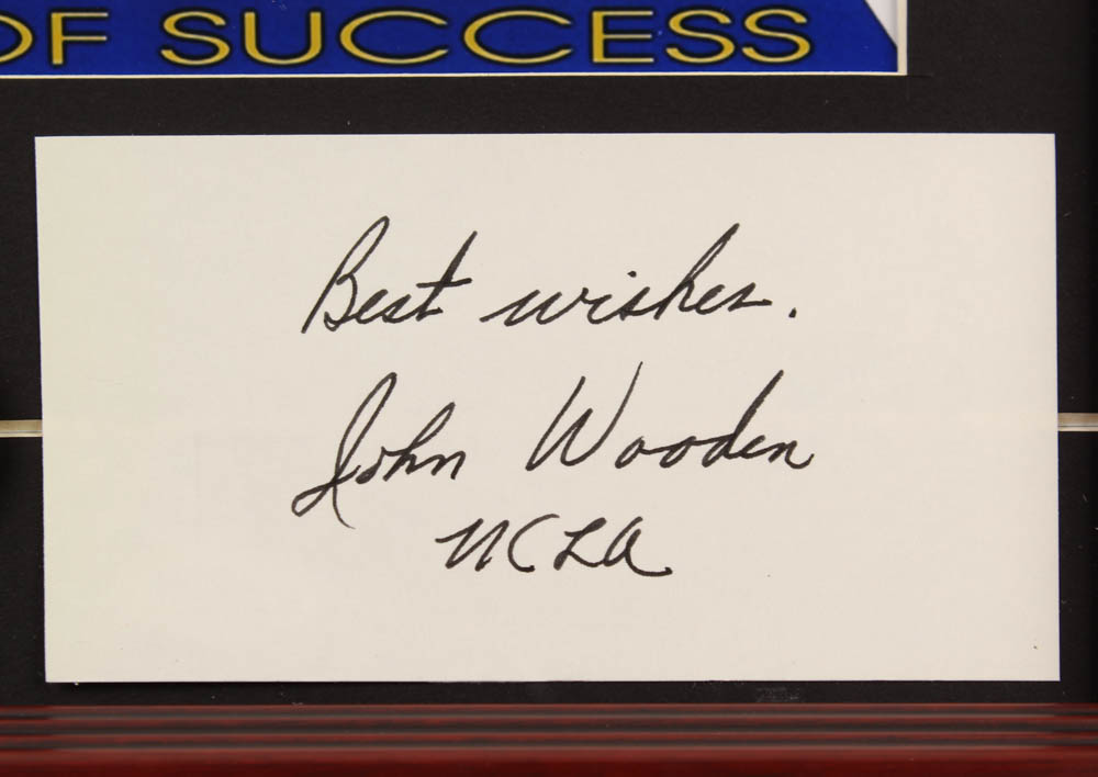 John Wooden Signed "The Pyramid of Success" 13.5x13.5 Custom Framed Cut Display with Vintage Pin Inscribed "Best Wishes" & "UCLA" (PSA COA)