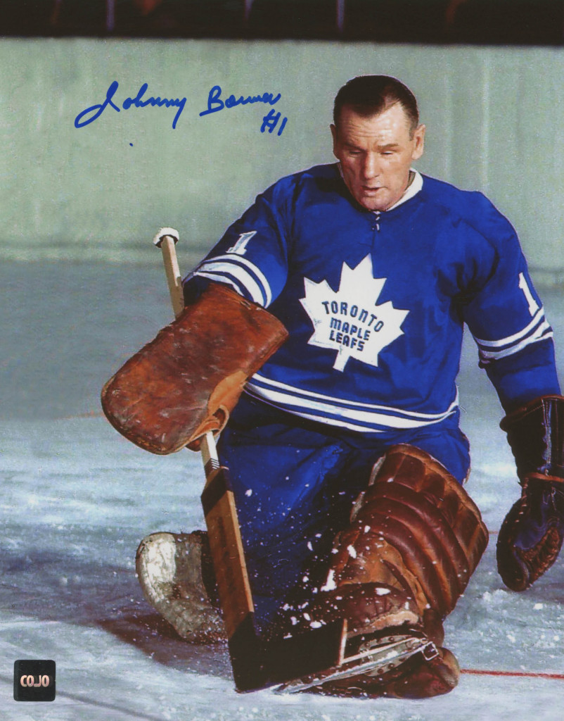 Photo measures 8" x 10" in size and has been hand-signed in blue felt-tip pen by Johnny Bower (D. 2017, Toronto Maple Leafs, HOF).