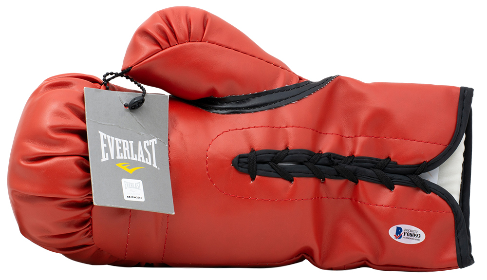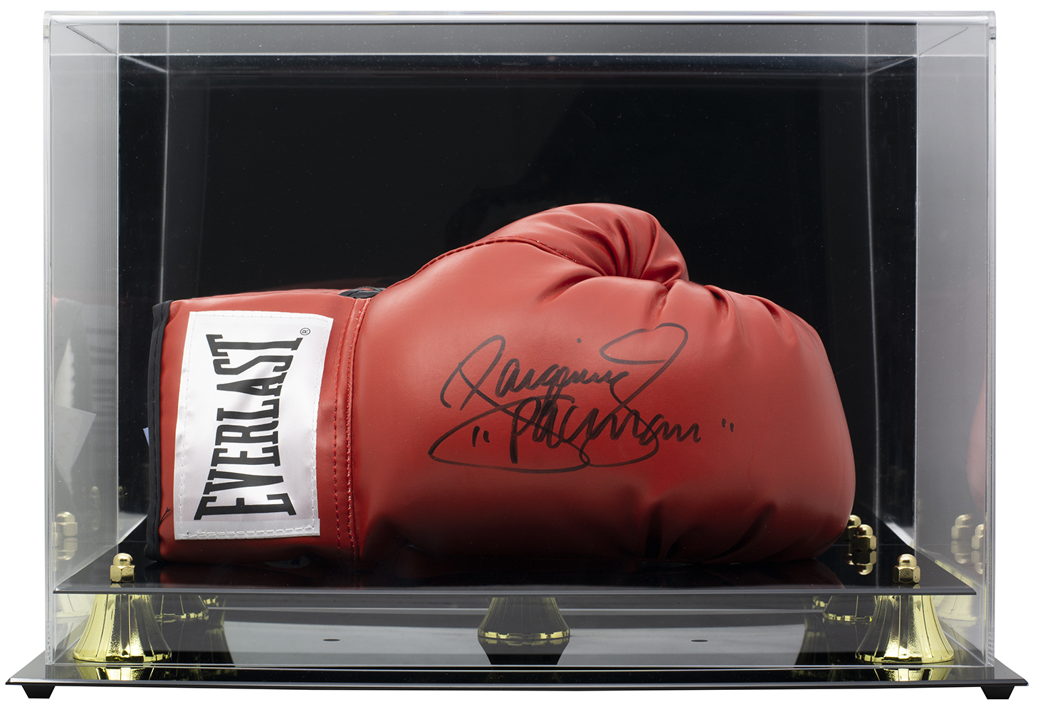 Everlast boxing glove has been hand-signed in black felt-tip pen by Manny Pacquiao. The auction includes a high quality display case with a wood base and glass cube.