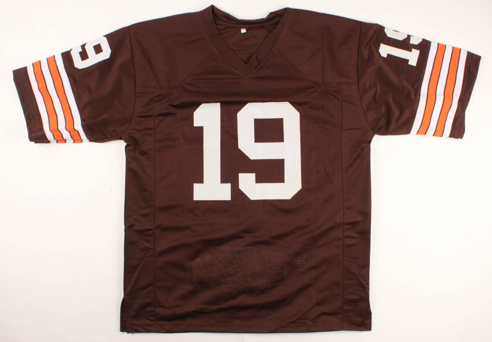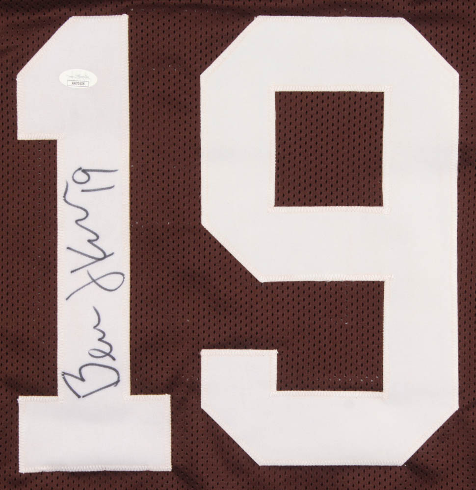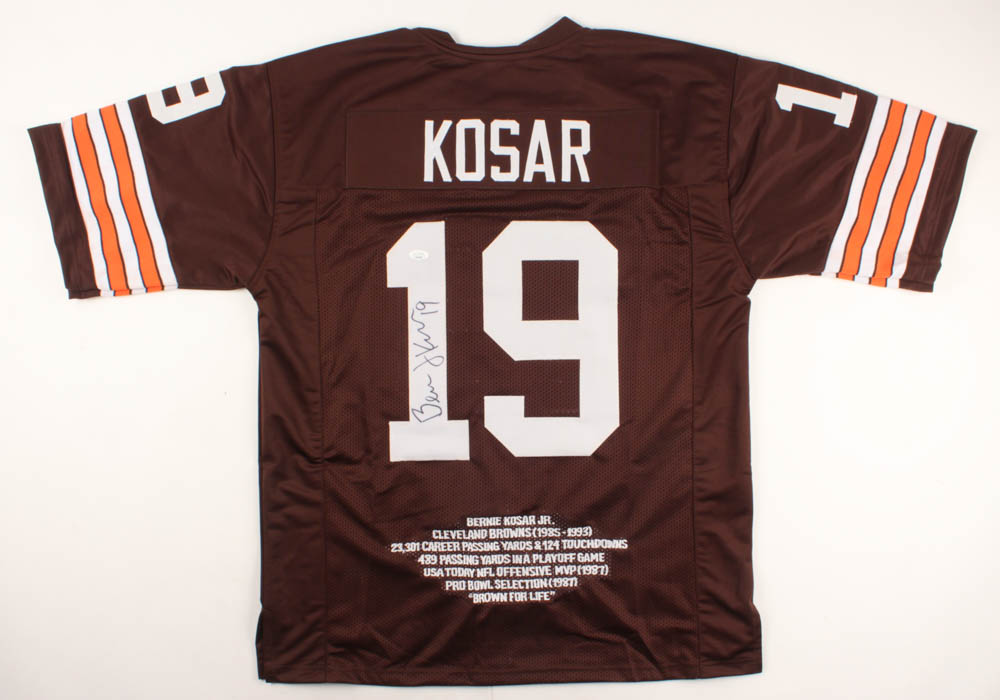 Custom on-field style jersey. Everything is sewn on, size XL. Hand-signed in black felt-tip pen by Bernie Kosar. Kosar's career highlights have been custom stitched onto the back of the jersey below the reverse numbers.