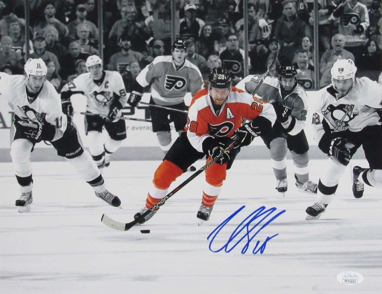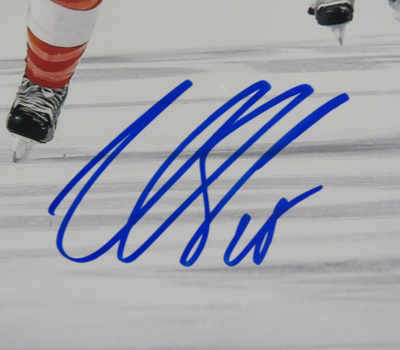 Photo measures 11" x 14" in size and has been hand-signed in blue felt-tip pen by Claude Giroux (Philadelphia Flyers).