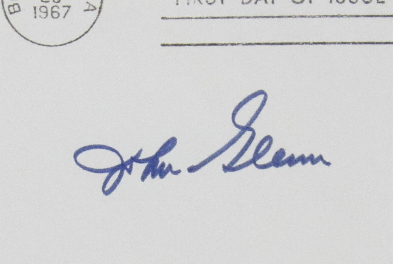 Custom frame measures 16"x 24" in size and features a FDC envelope that has been hand-signed in blue felt-tip pen by John Glenn (D.2016).