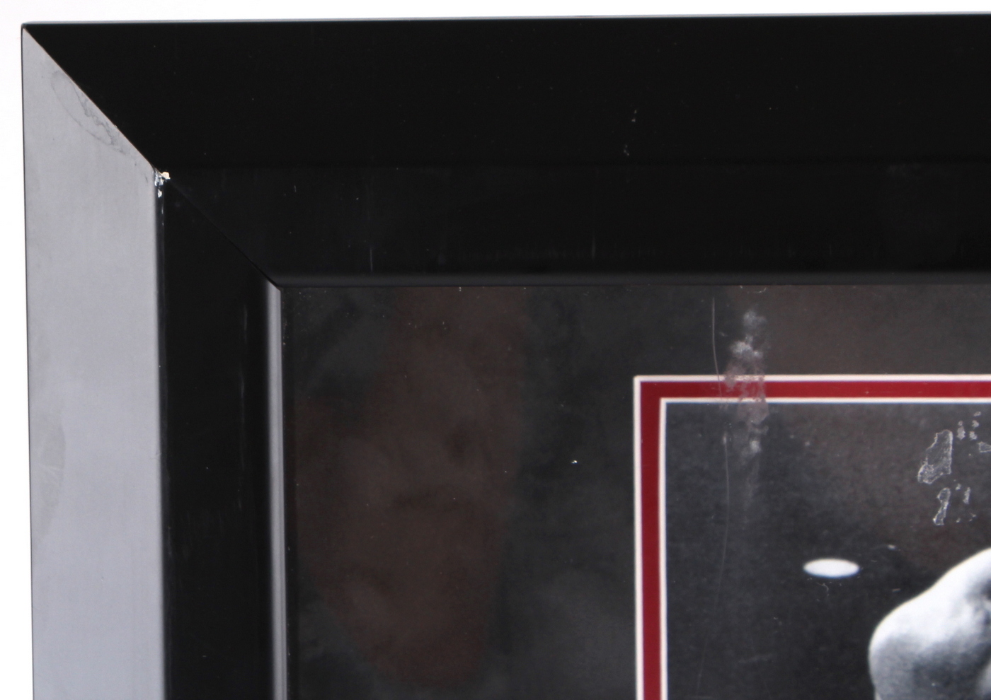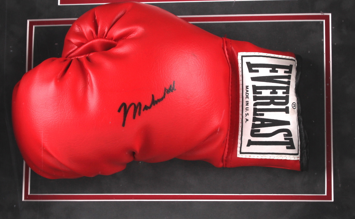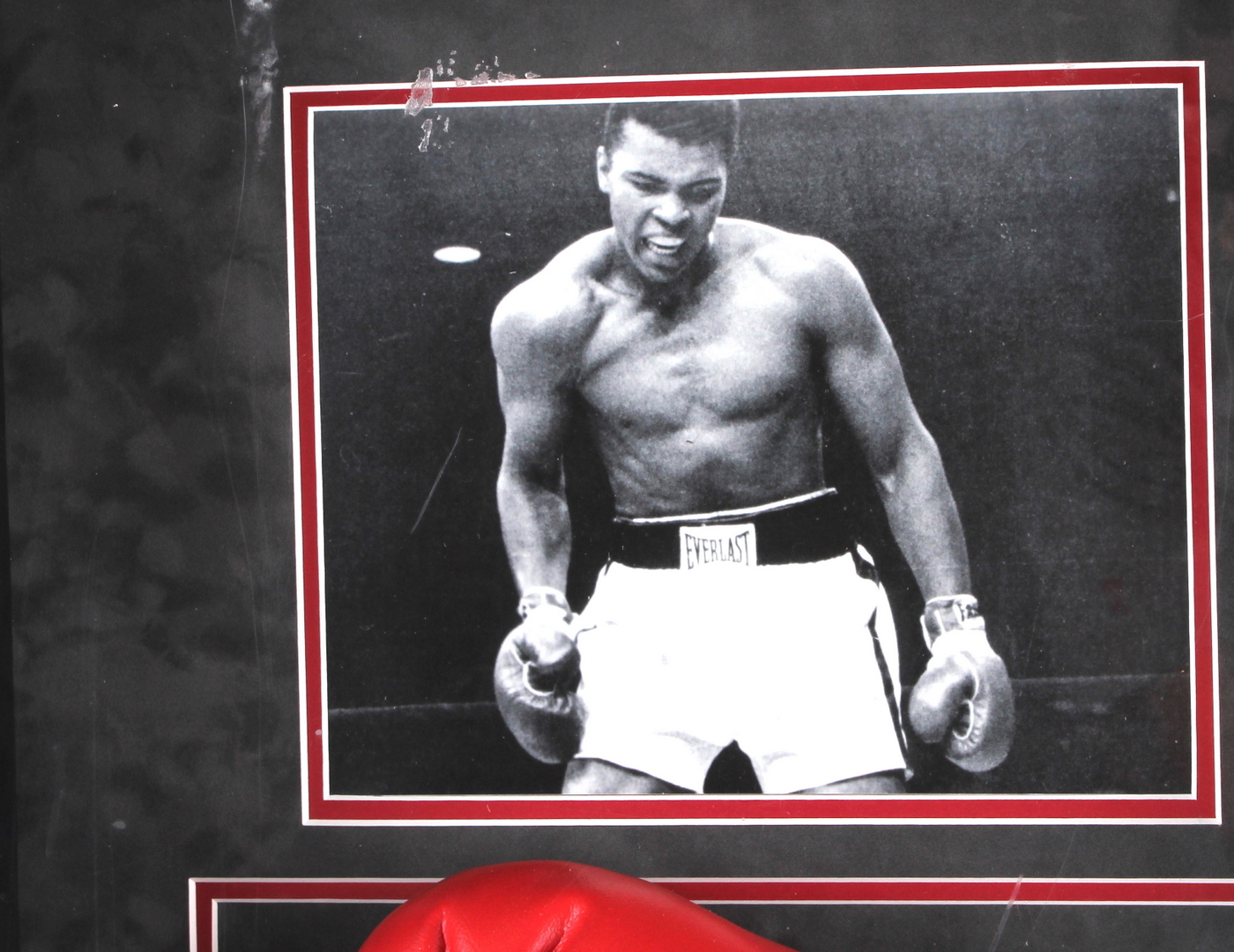 Custom framed boxing glove display measures approximately 22" x 33" in size with a depth of 5". The glove has been hand-signed in black felt-tip pen by Muhammad Ali. Display also includes an 8" x 10" photo of Muhammad Ali. The autograph includes a James Spence Authentication (JSA) Auction House LOA for authenticity purposes. Please note that the frame has been scratched. See photos for more details.