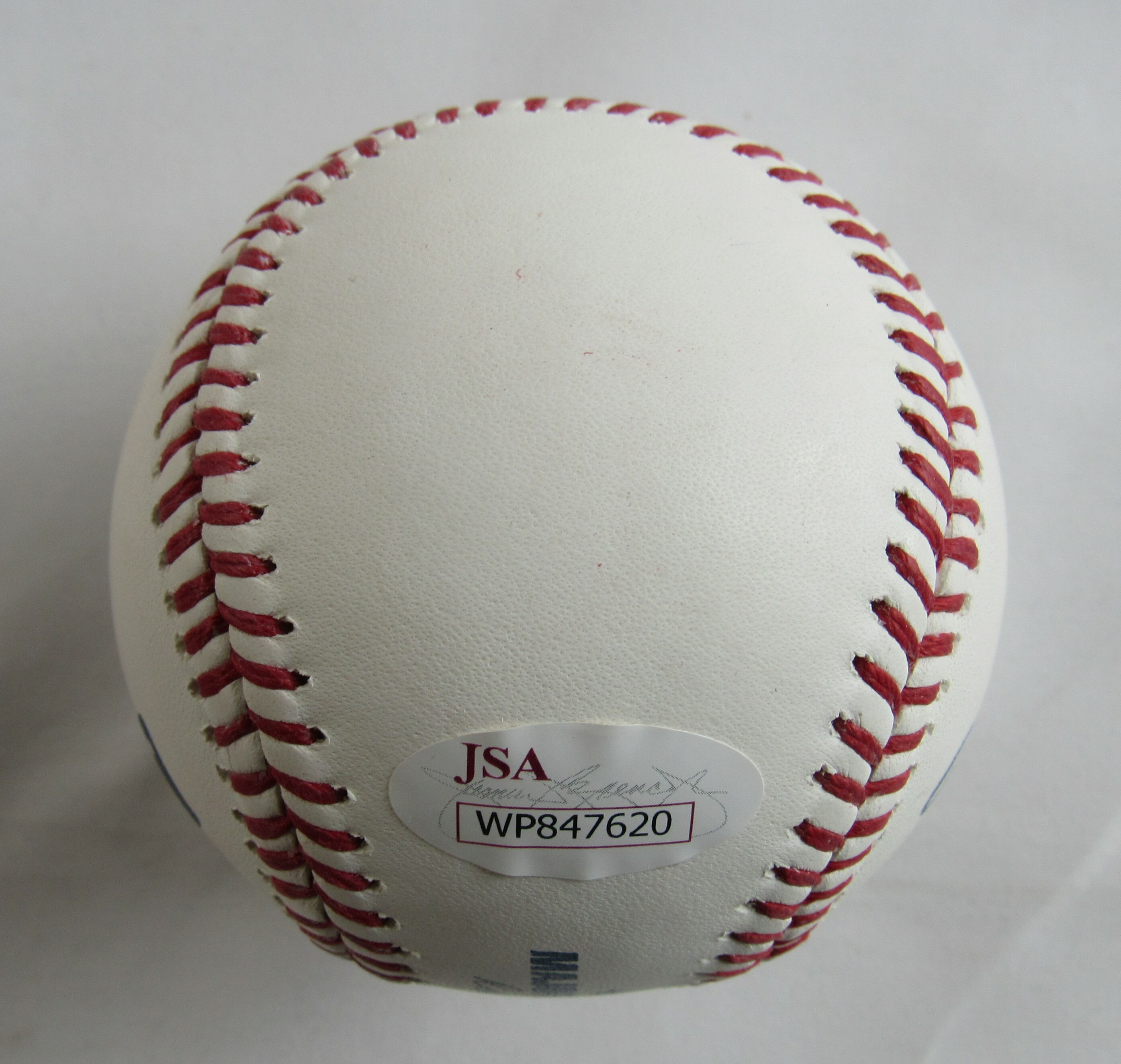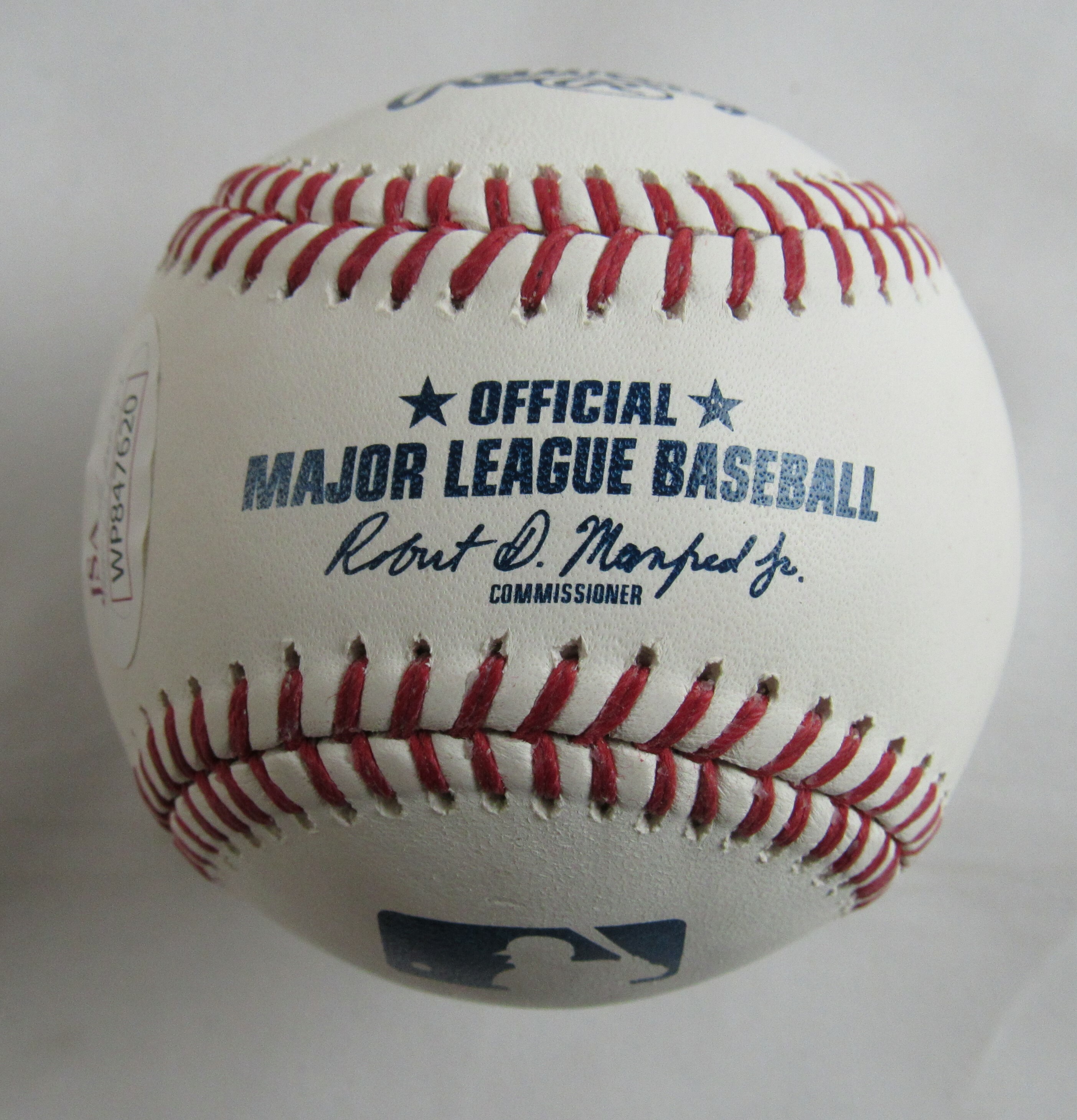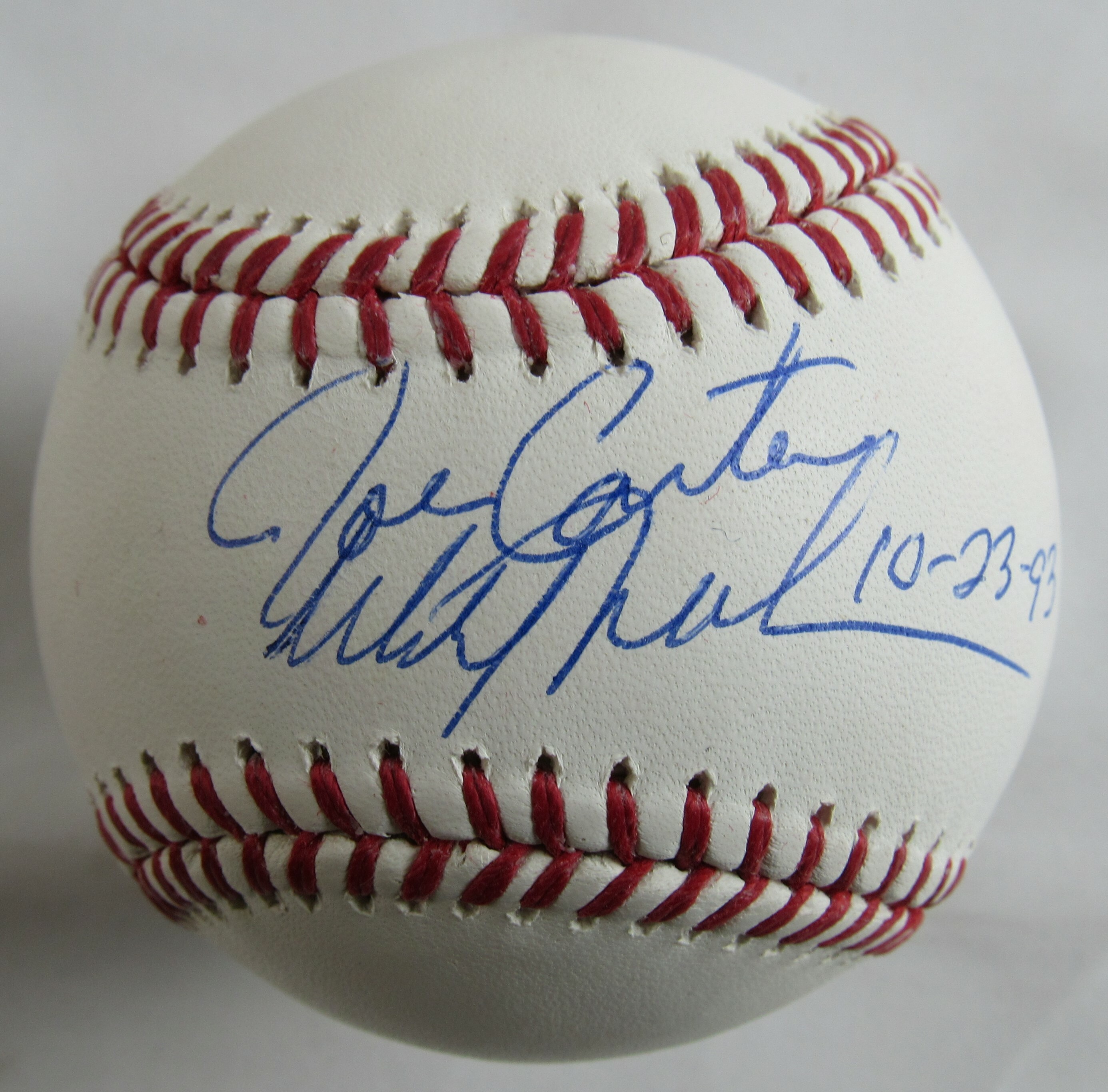 Rawlings Official Major League baseball. Hand-signed and inscribed in blue ink pen by Joe Carter (Toronto Blue Jays) and Mitch Williams (Philadelphia Phillies).