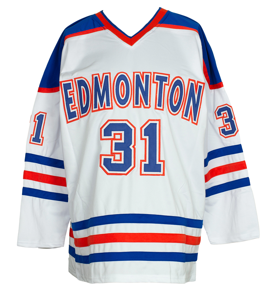 Custom on-ice style jersey. Everything sewn on, size XL. Hand-signed in silver paint pen by Grant Fuhr (HOF).