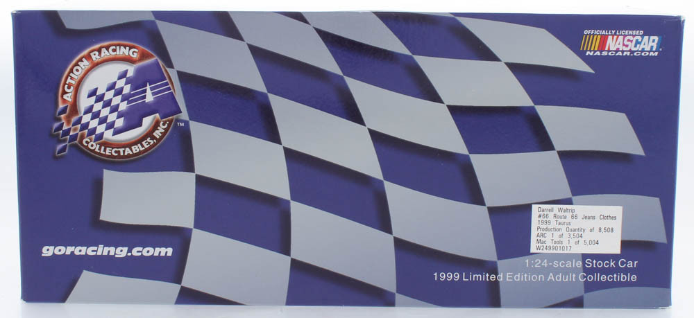 Darrell Waltrip #66 Route 66 Jeans Clothes 1999 Taurus die cast car. The car is limited edition and has been numbered #/8,508. Please note, car is unsigned. See images for details regarding the condition of the car and packaging.