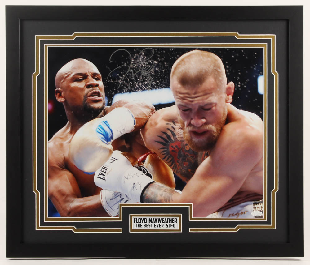 Custom framed display measures approximately 22" x 26" in size and features a photo that has been hand-signed in silver paint pen by Floyd Mayweather Jr.