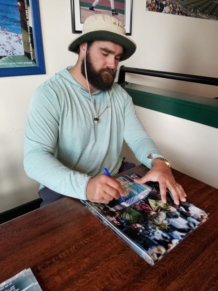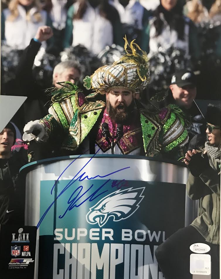 Photo measures 11" x 14" in size and has been hand-signed in blue felt-tip pen by Jason Kelce (Philadelphia Eagles).