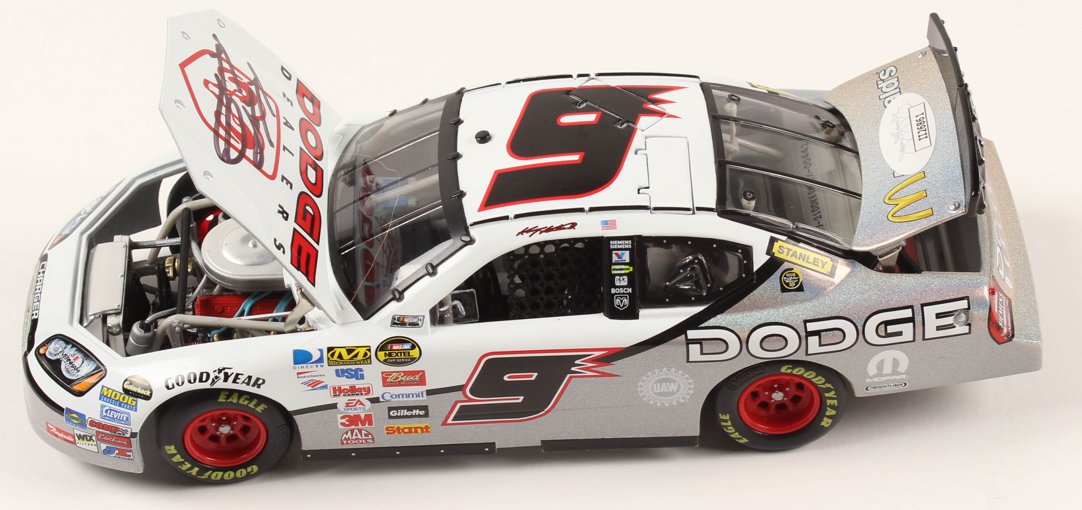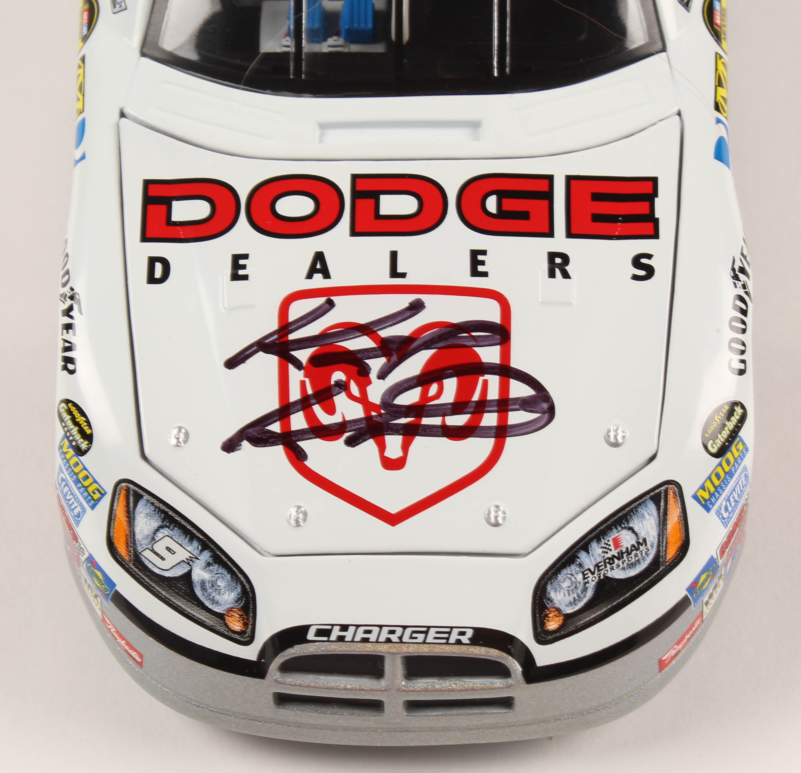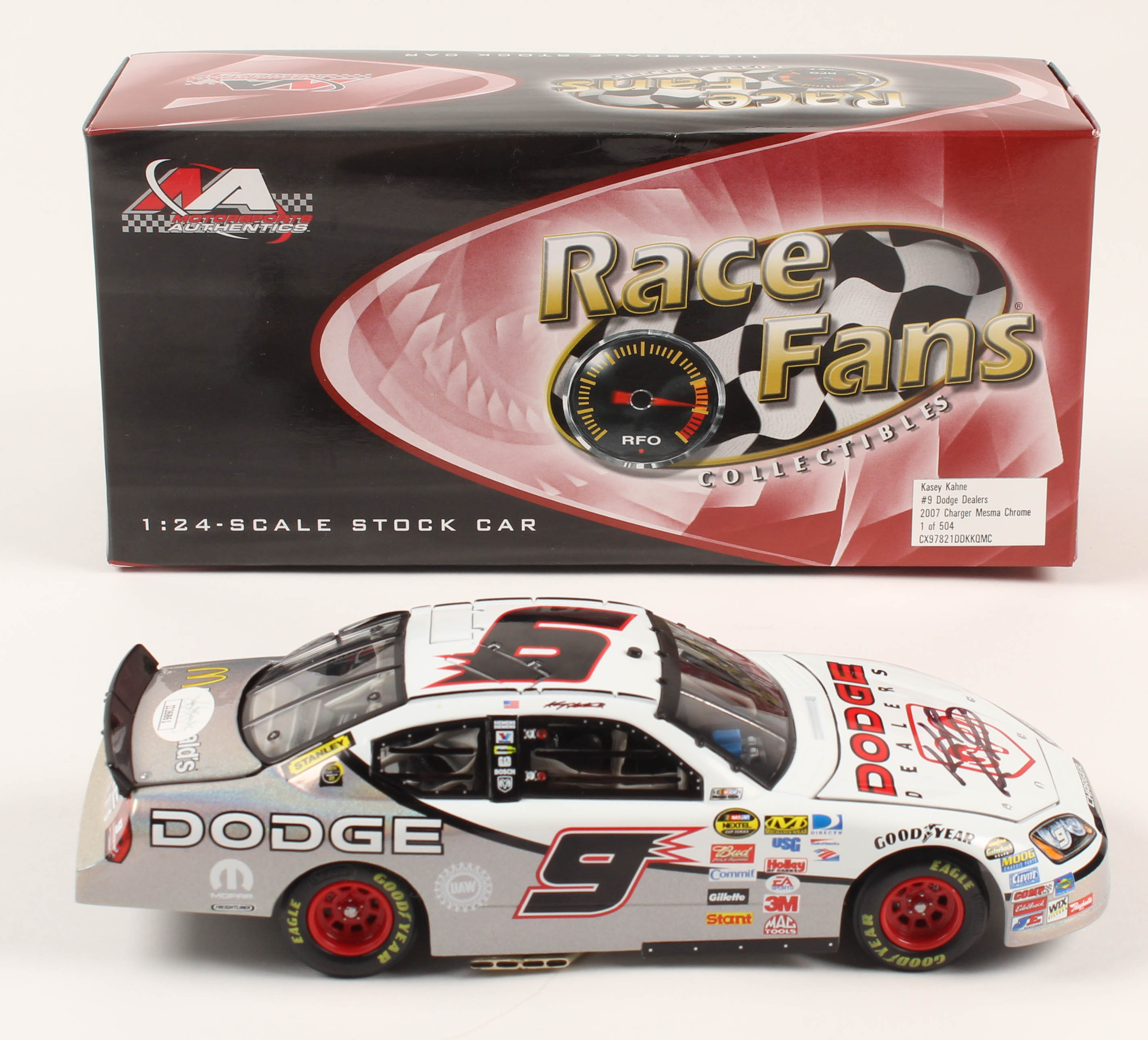 Limited edition #9 Dodge Dealers 2007 Charger Mesma Chrome 1:24 Die-Cast Car. Hand-signed in black felt-tip pen by Kasey Kahne.