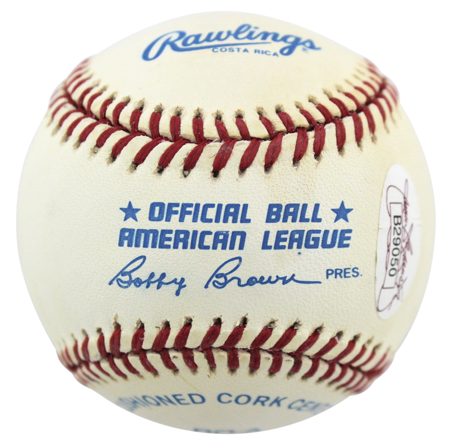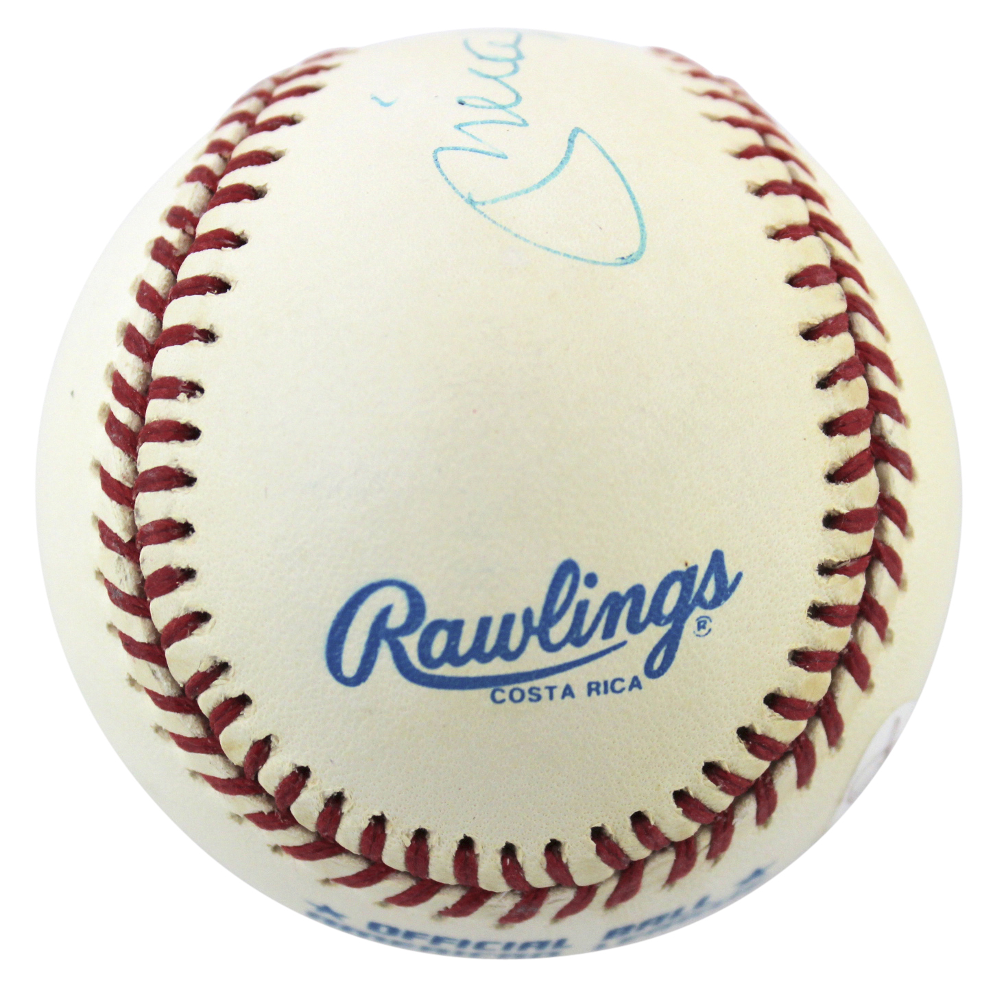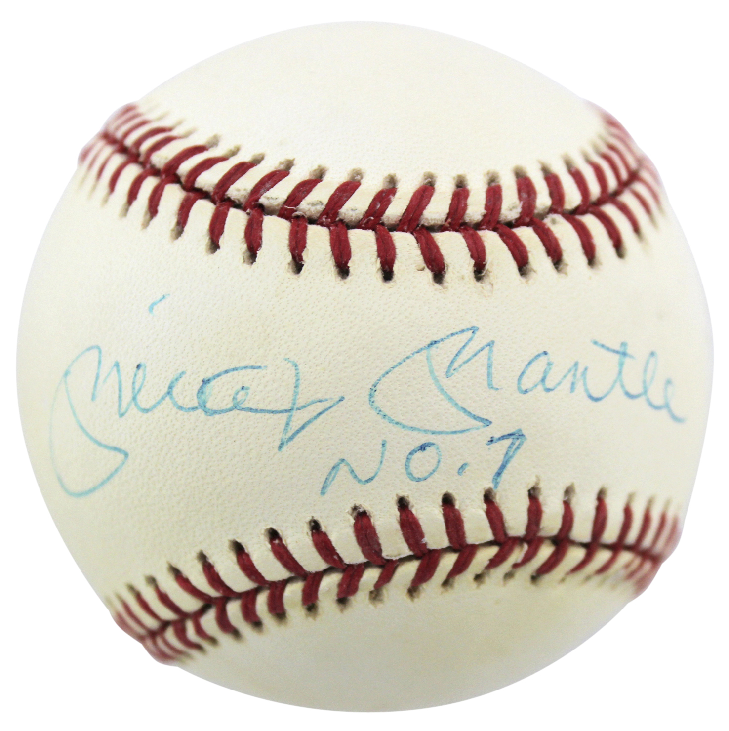 Rawlings Official American League Baseball has been hand-signed and inscribed in blue ink pen by Mickey Mantle. (D. 1995, New York Yankees, HOF) Please note the baseball shows signs of natural toning.