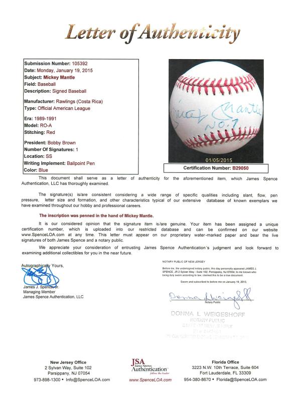 Mickey Mantle Signed OAL Baseball Inscribed "No. 7" (JSA LOA)