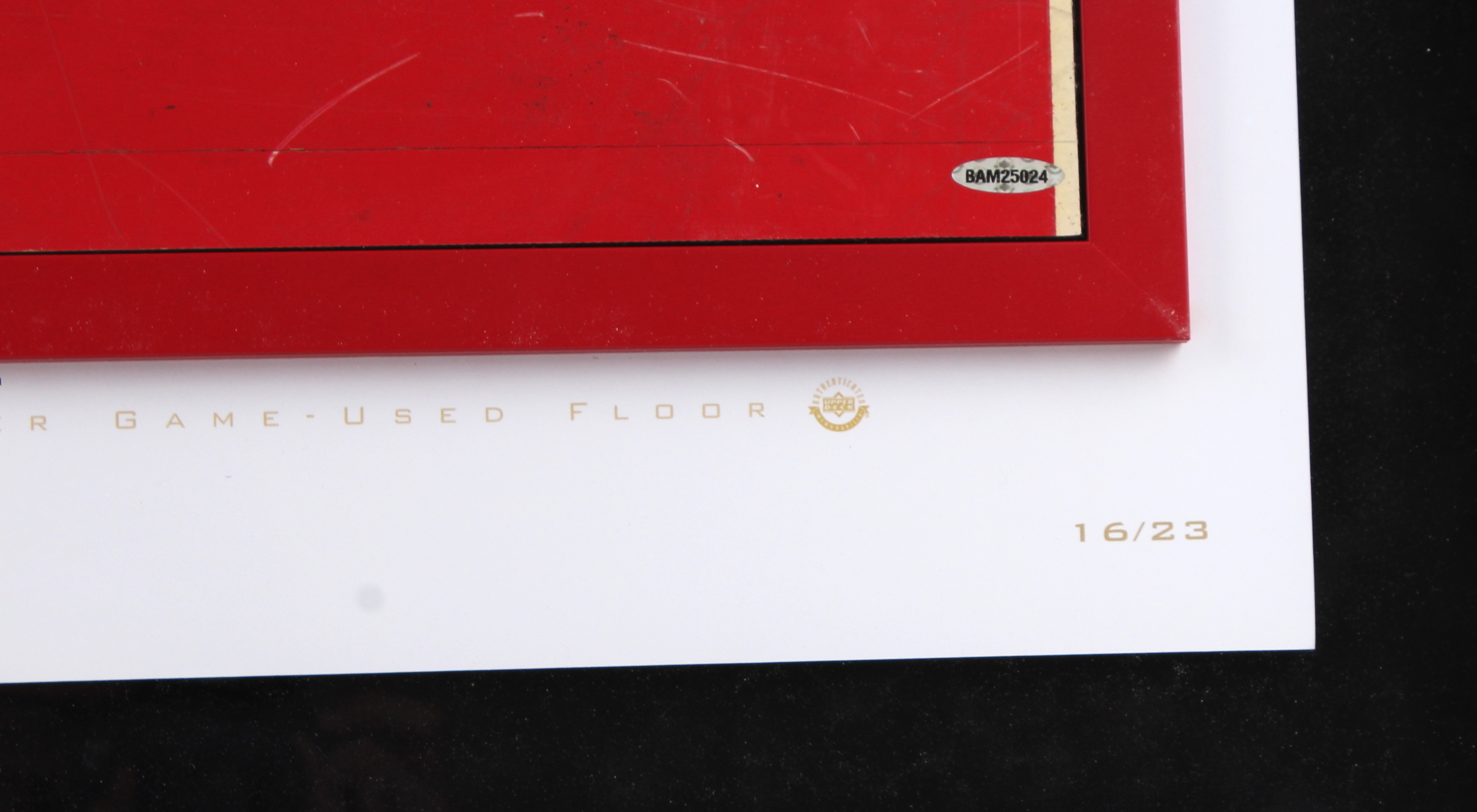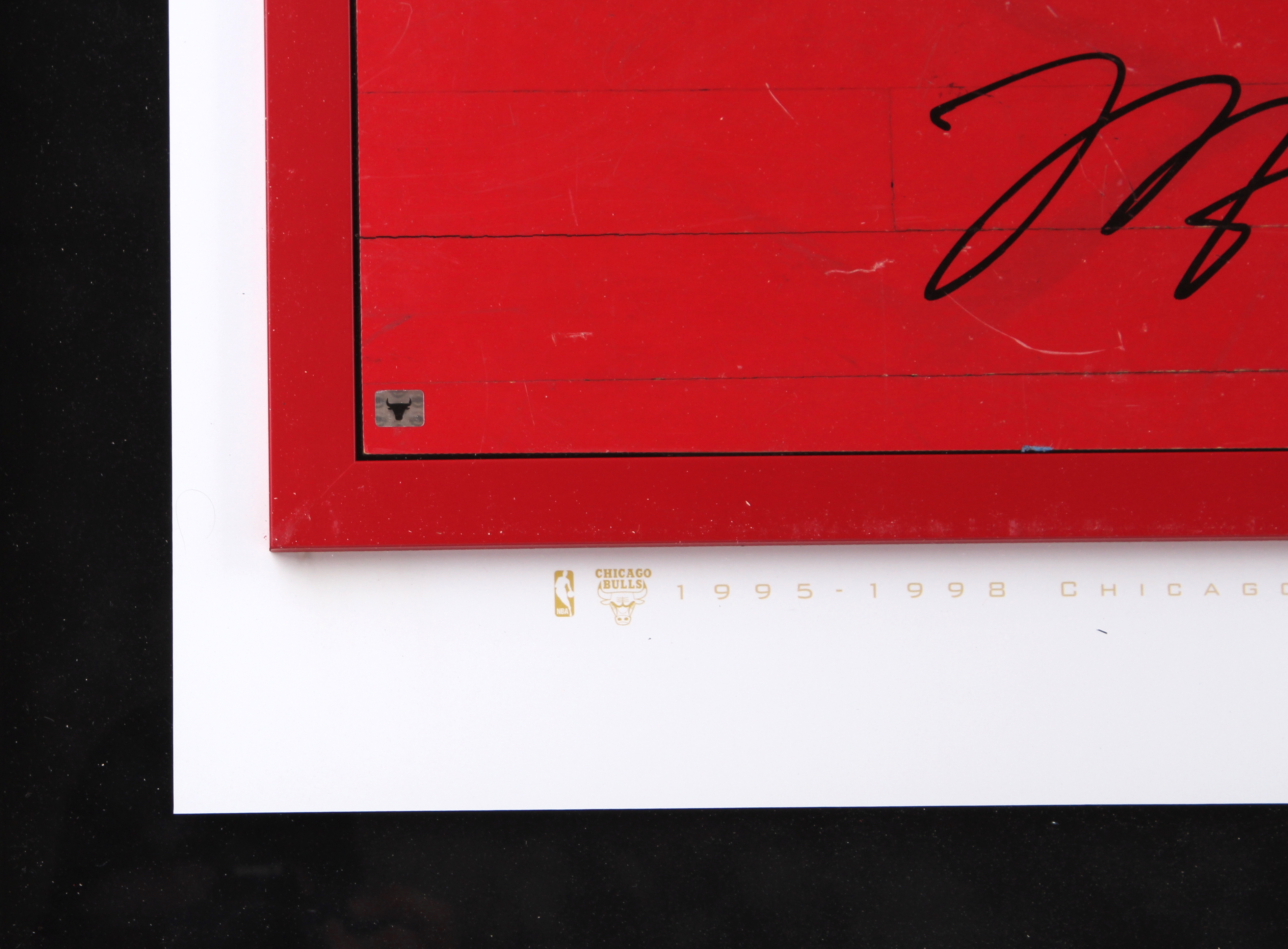Custom framed photo display measures 26" x 36" in size and features a 6" x 26" authentic game-used floor piece that is hand-signed in silver paint pen by Michael Jordan (Bulls HOF). Limited Edition #16 / 23.