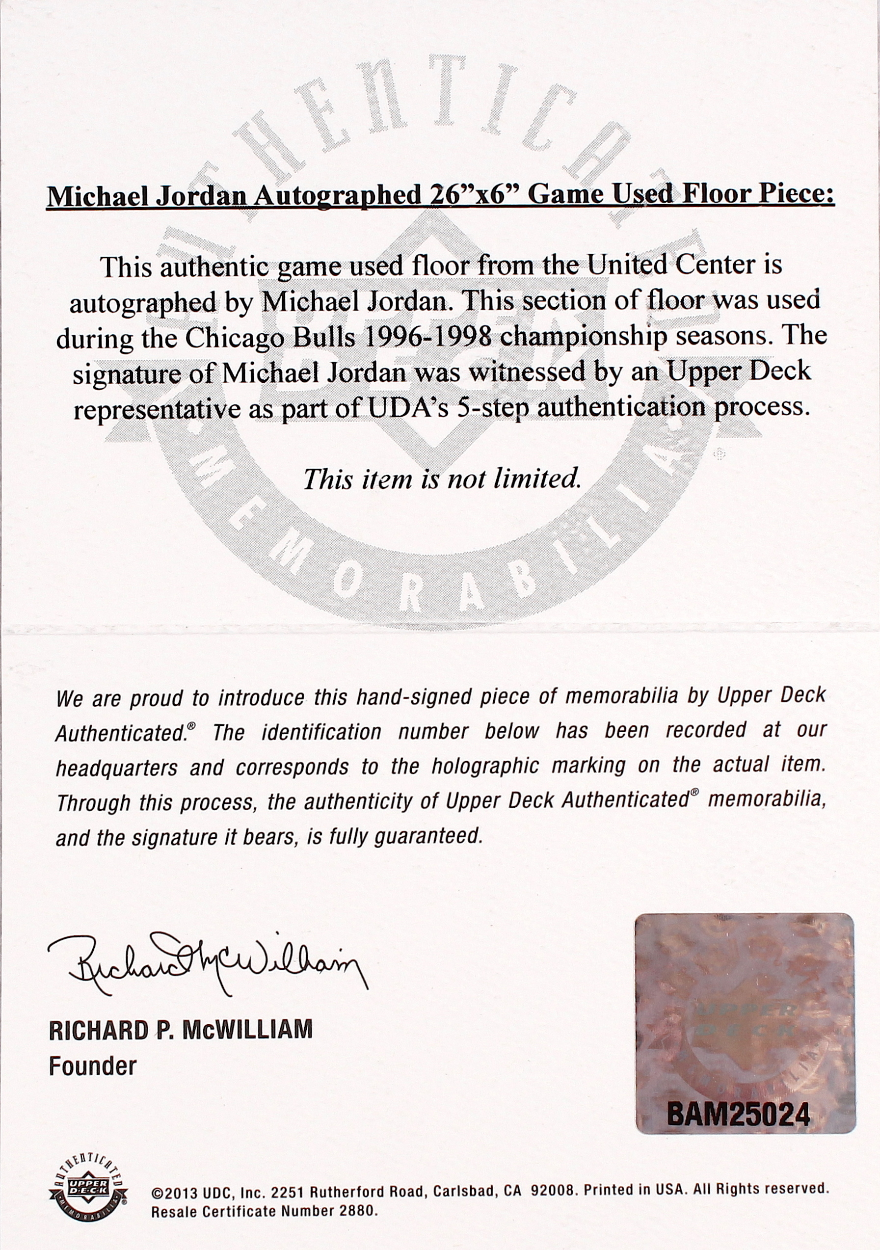 The autograph includes an official Upper Deck Authenticated (UDA) hologram and matching COA for authenticity purposes.