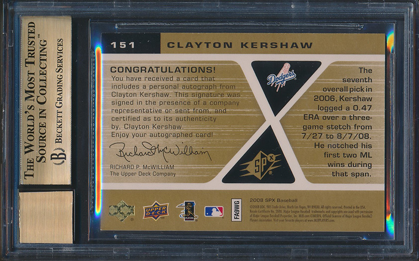 2008 SPx #151 Clayton Kershaw Autograph RC (BGS 9.5)