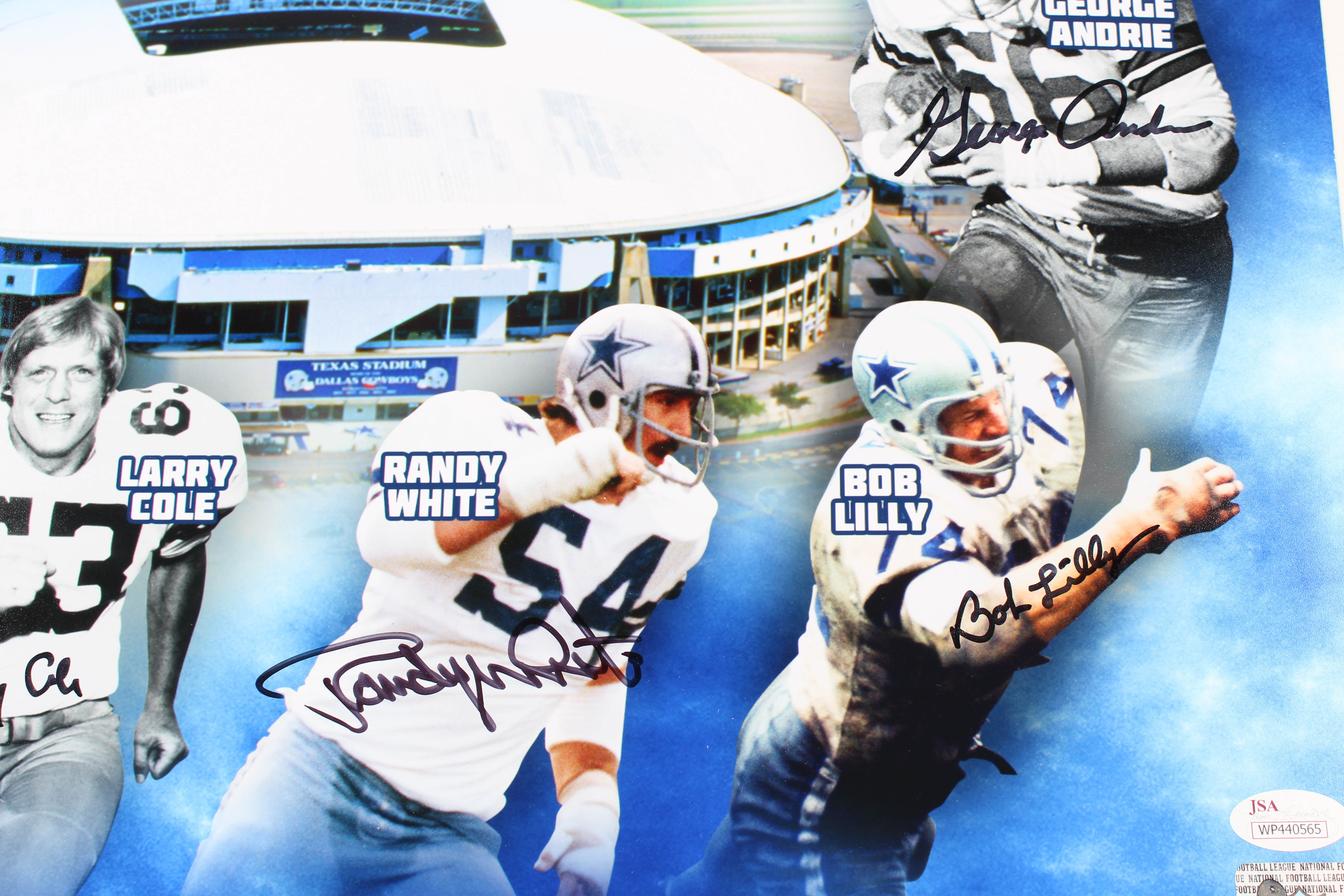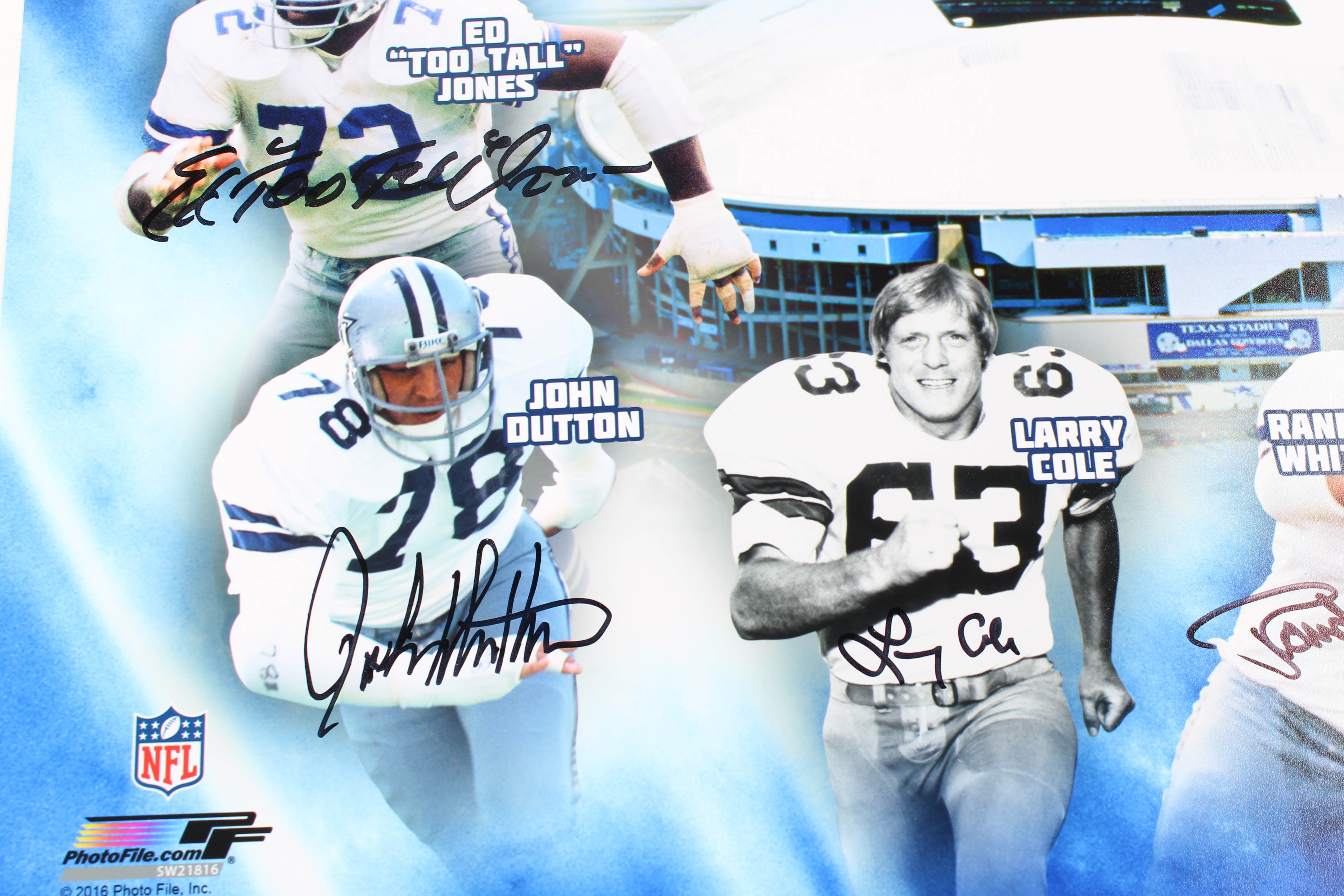 Photo measures 16" x 20" in size and has been hand-signed in black felt-tip pen by Bob Lilly, Randy White, Ed "Too Tall" Jones, George Andrie, John Dutton and Larry Cole.